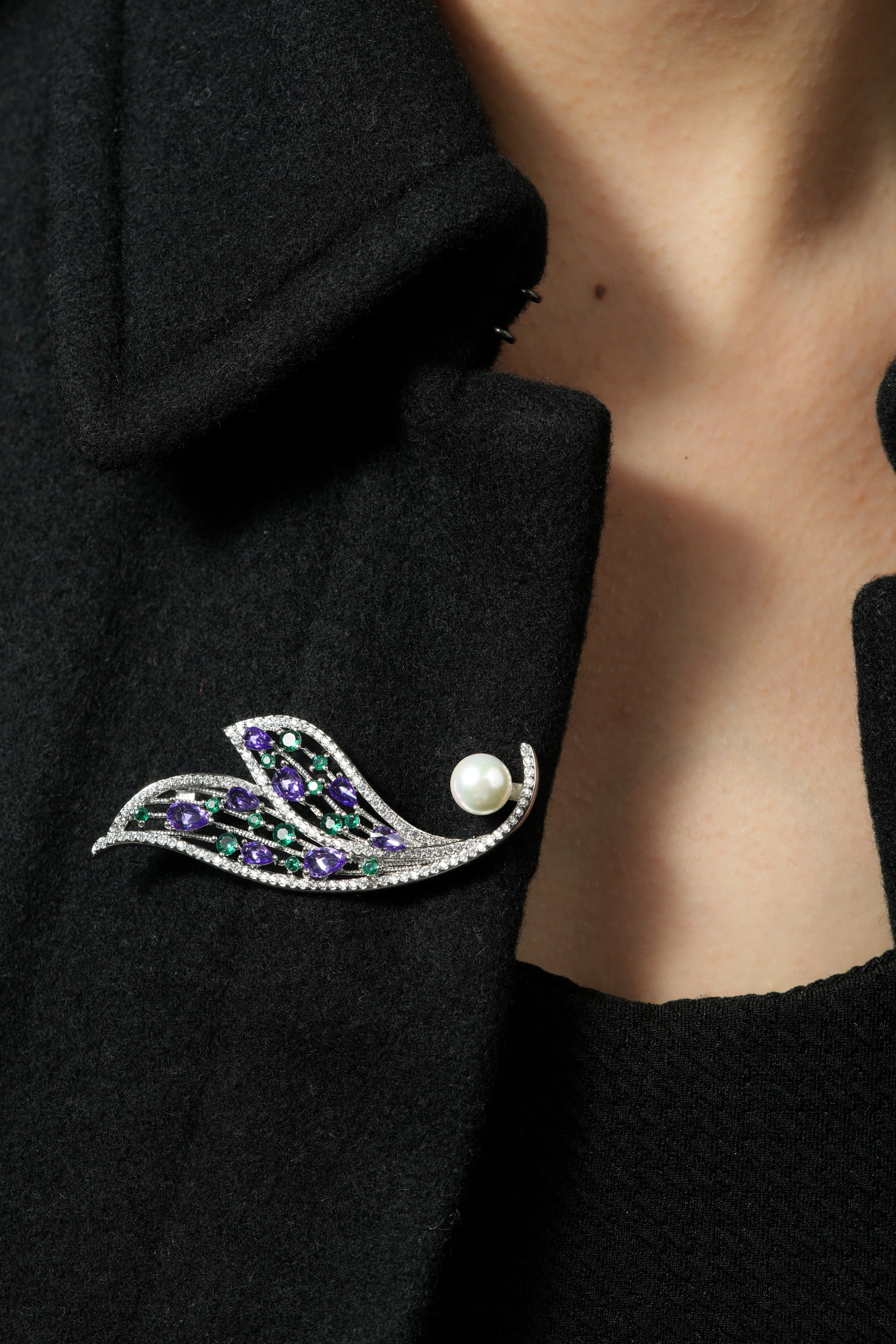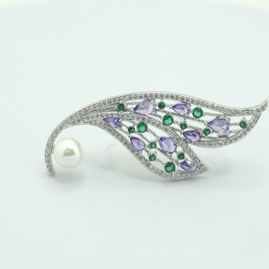 Amethyst and Emerald Feather Brooch | Silver Tone Wing Inspired Brooch with Purple Teardrop and Green Round CZ Stones, Full Pave Finish and Pearl Accent | Elegant Festive and Bridal Statement Pin