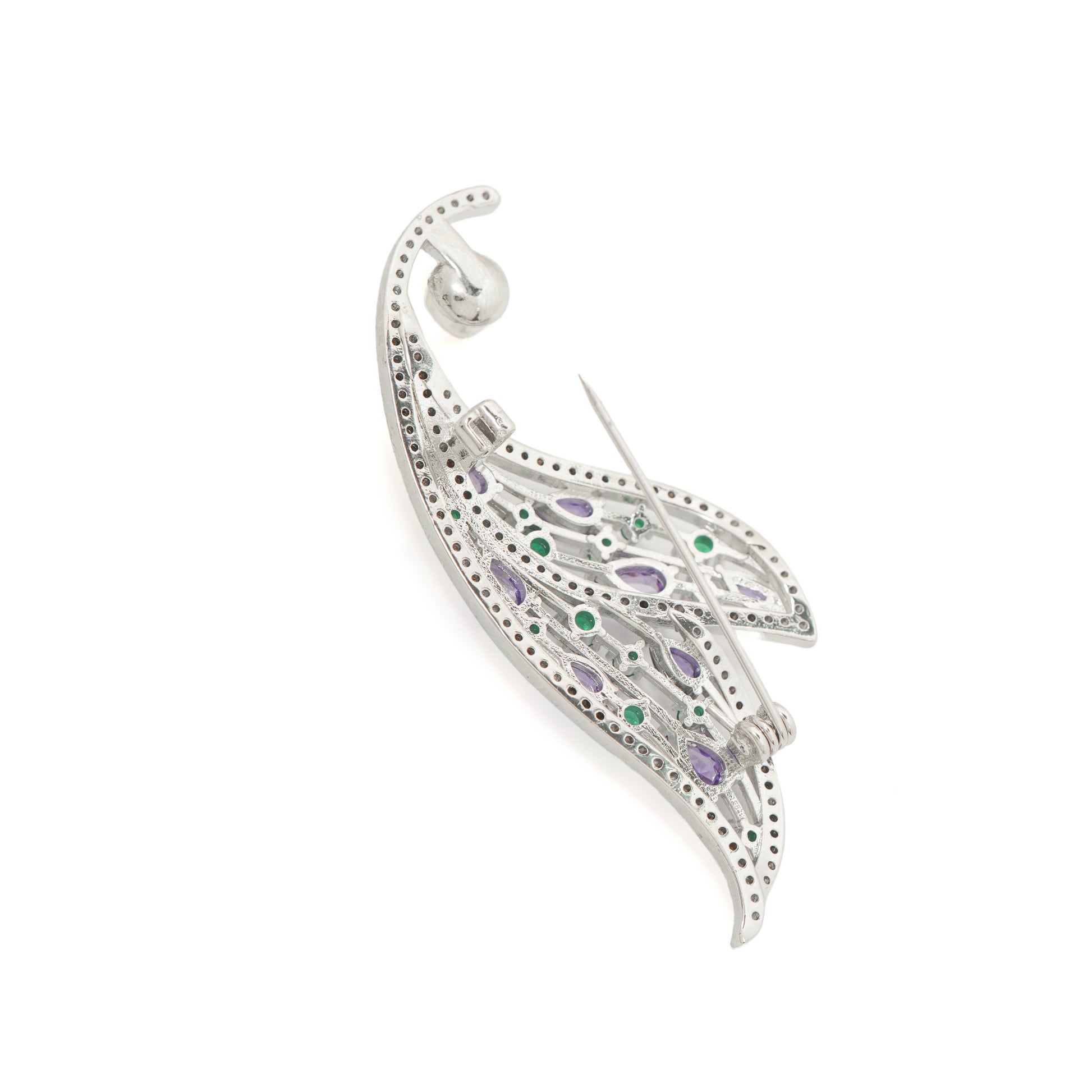 Elevate your jewellery collection with the Amethyst and Emerald Feather Brooch, a beautifully crafted silver tone accessory that blends luxury, colour and graceful movement. Designed in the shape of a stylised feather or wing, this brooch features a full surface of brilliant clear pave CZ stones, creating a radiant and shimmering base.