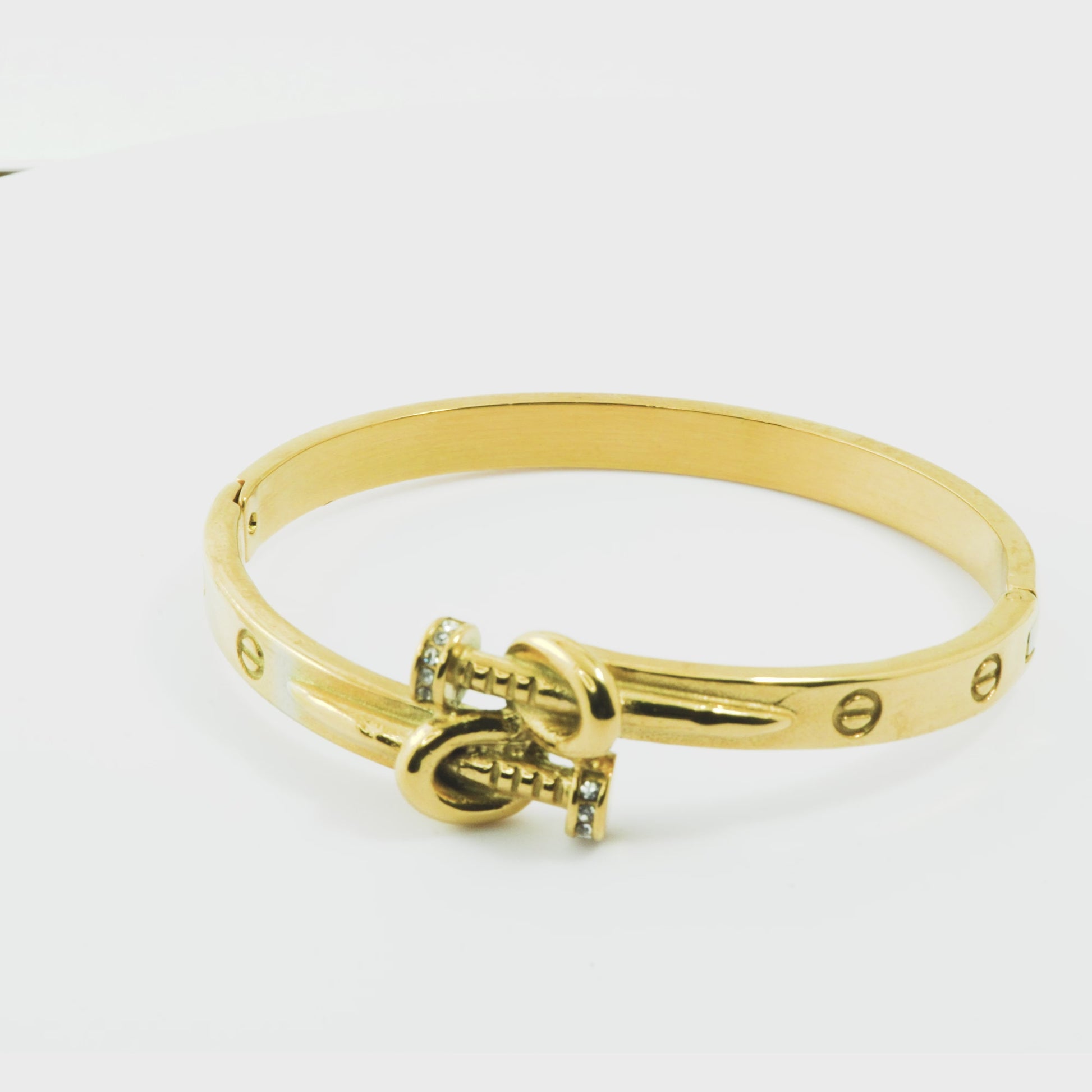 A striking and avant-garde gold-tone bracelet featuring a contemporary knot design where two 'nail' or spike-like elements are intertwined. The heads of the nails are accented with subtle cubic zirconia stones for a touch of luxury. The smooth, wide band is subtly stamped with circular details, making it a bold, fashion-forward statement piece.