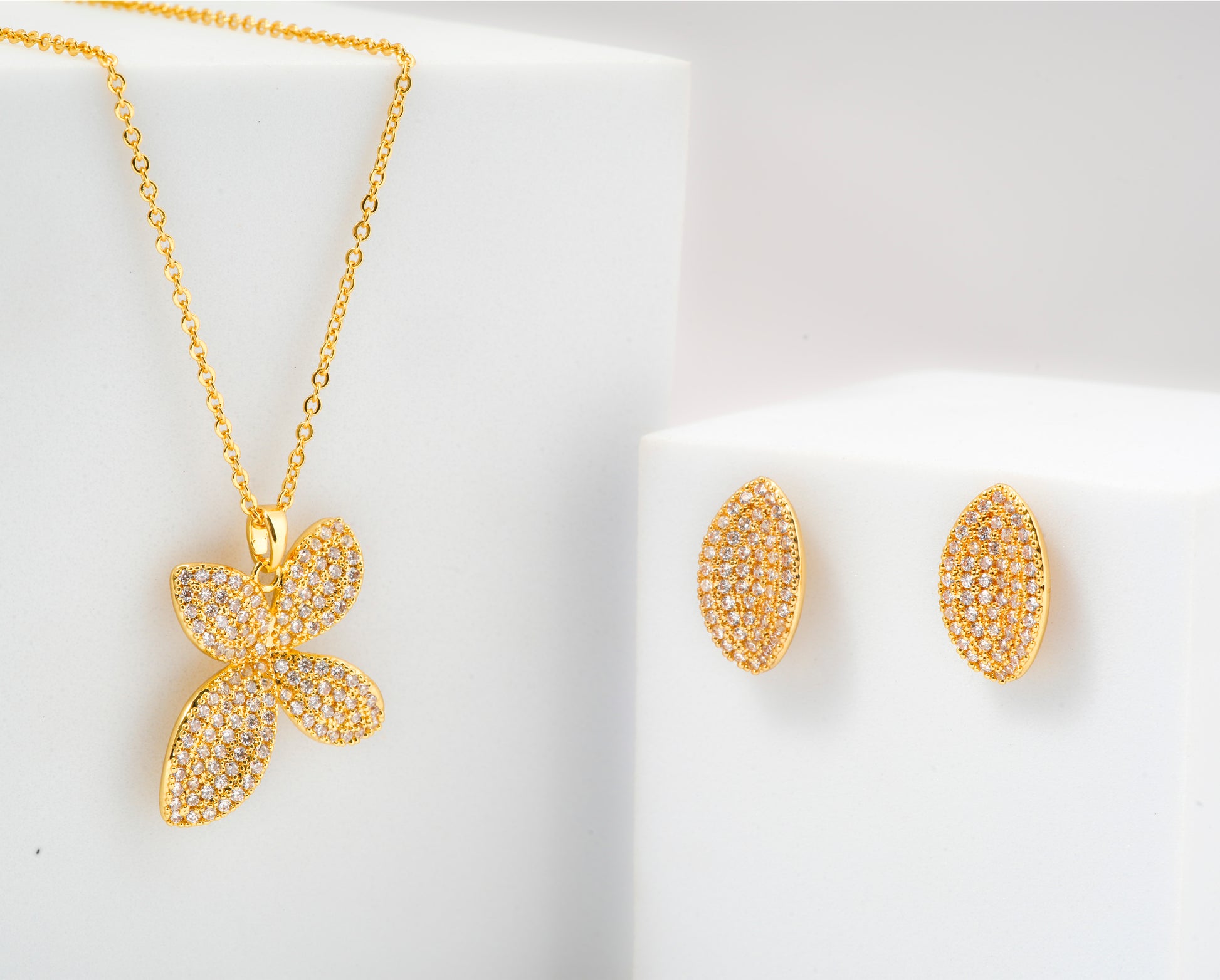 Bring elegance and sparkle to your look with this Gold Plated Butterfly Pendant Necklace and Earrings Set. The pendant is beautifully crafted in the shape of a butterfly, fully embellished with dazzling crystals that shimmer from every angle. Paired with matching oval crystal-studded earrings, this set offers a harmonious balance of glamour and sophistication.