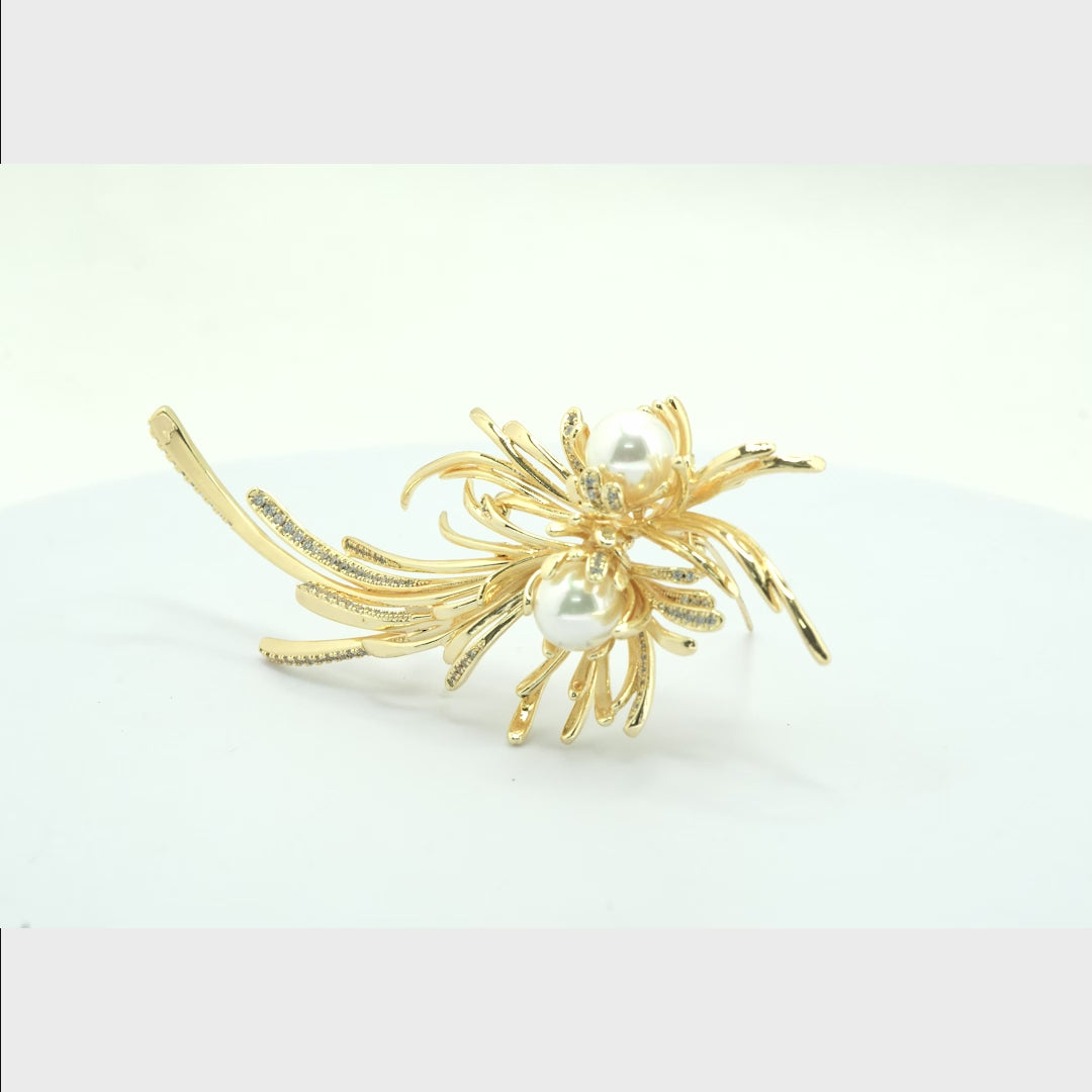 Celestial Burst Pearl Brooch | Gold-Tone Starburst Floral Pin with Pave CZ Stems & Twin Imitation Pearls | Elegant Festive Statement Brooch