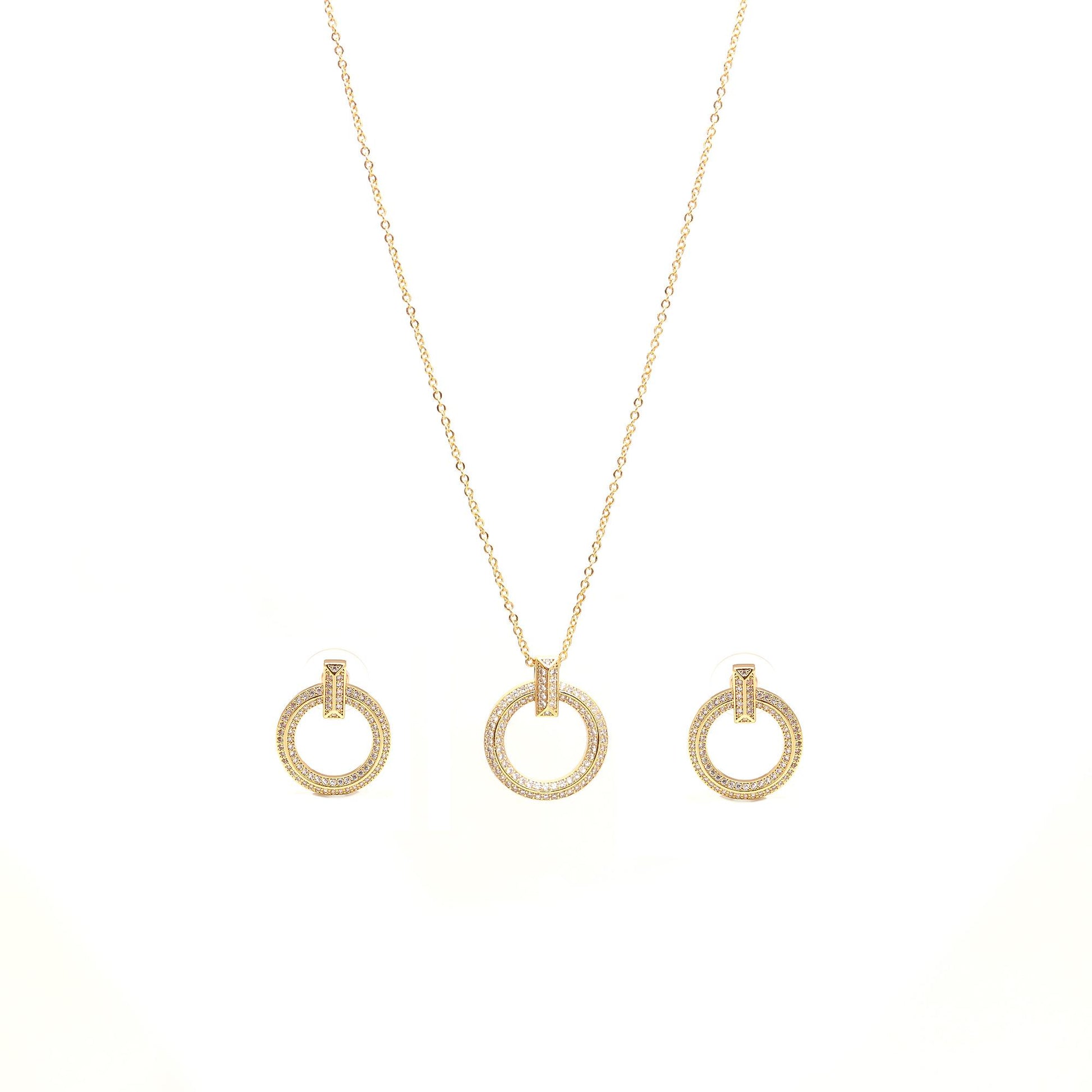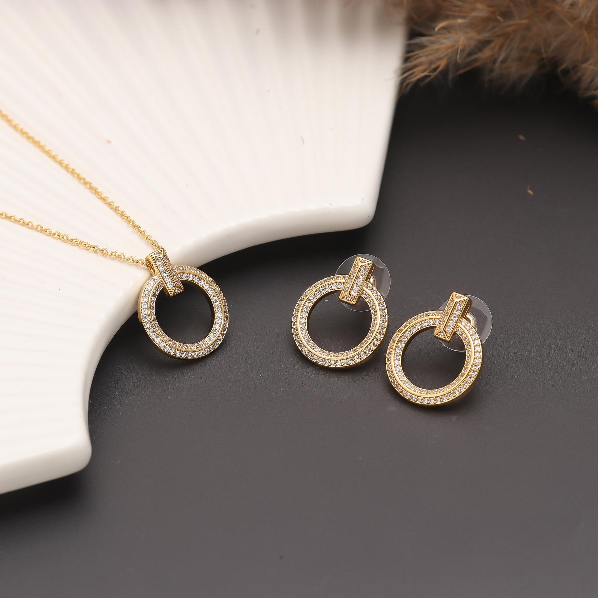 Elegant Gold-Plated Circular Pendant Necklace and Matching Earrings Set with Sparkling Diamond Accents | Timeless Jewelry for Every Occasion