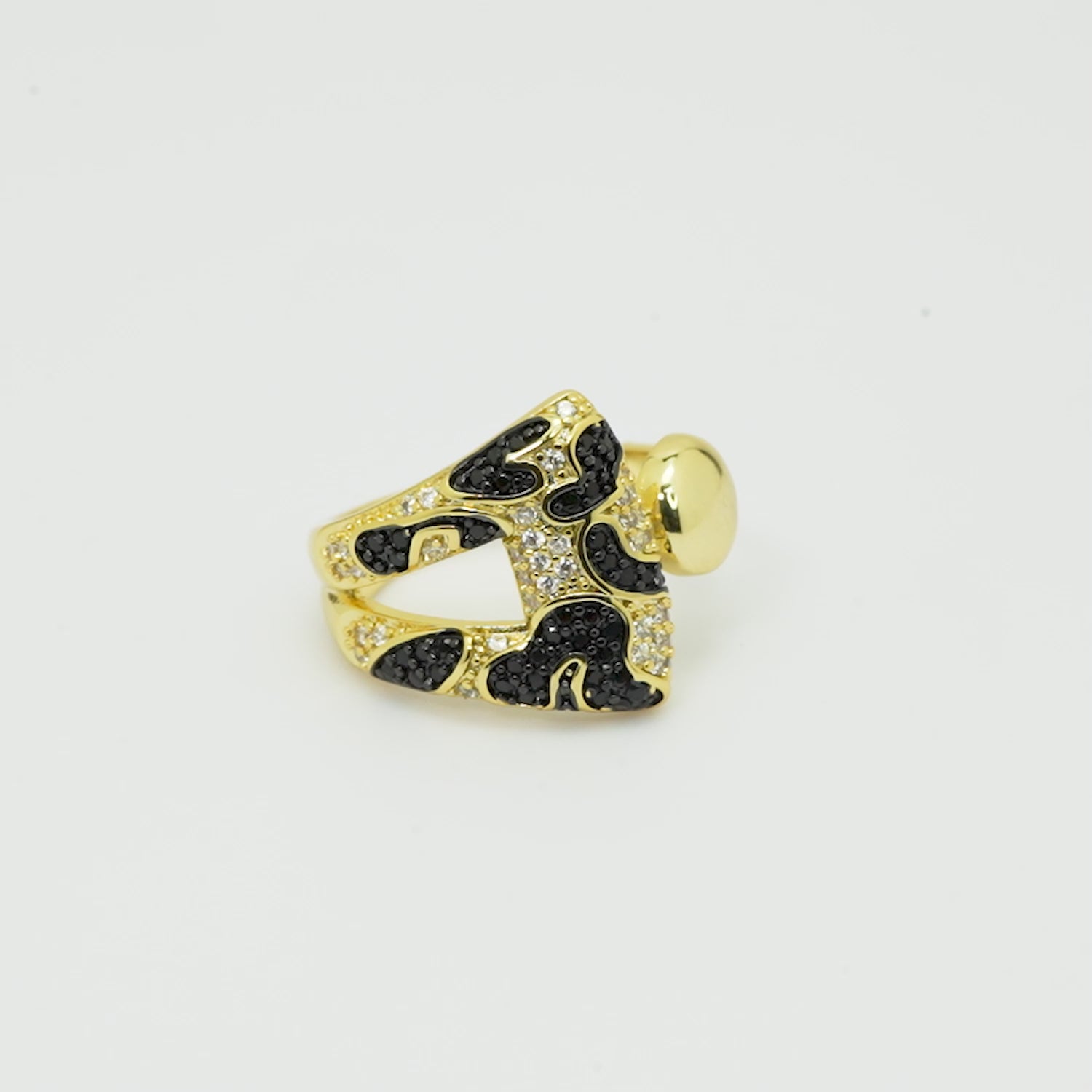 This abstract design ring for women is a unique piece of fashion jewelry that blends creativity with elegance. Featuring a modern abstract pattern with glossy black enamel and sparkling crystal detailing, this ring is finished in gold for a luxurious look. Its bold and trendy style makes it a perfect statement ring for fashion-forward women.