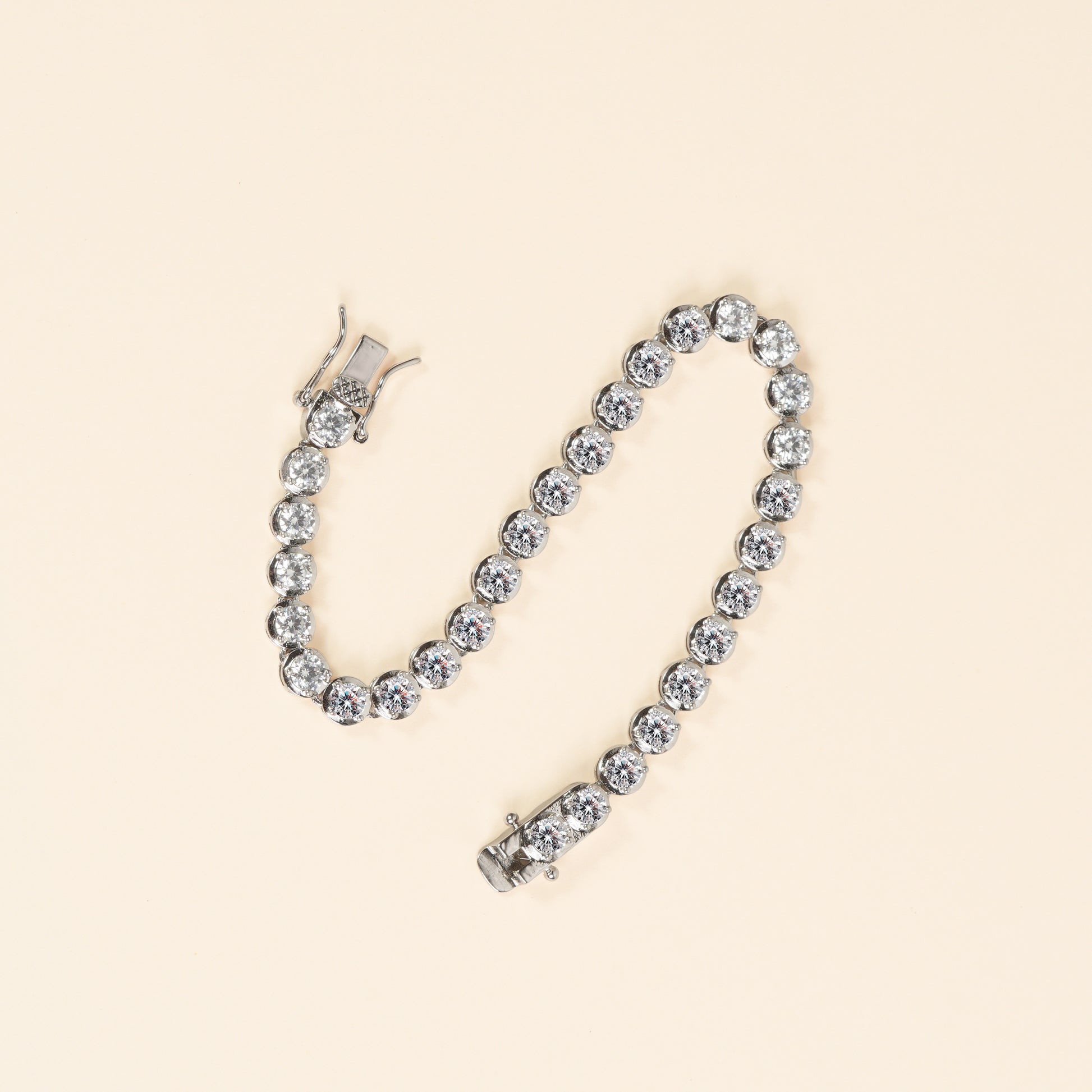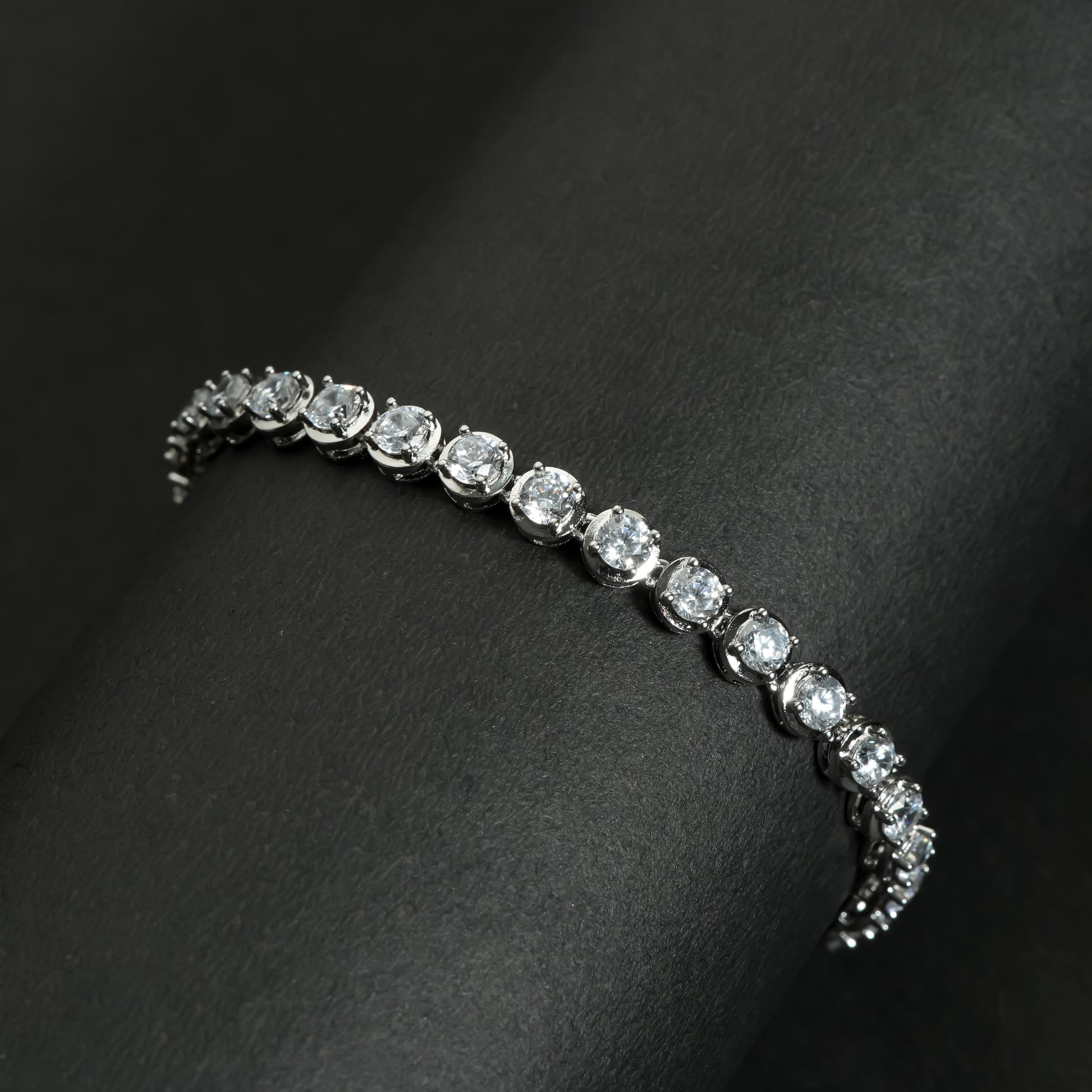 Each stone is prong-set to form a continuous circle of light that wraps smoothly around the wrist, creating a fluid shimmer with every movement. Its cool silver brilliance gives it a diamond-like appeal, making it an ideal choice for both sophisticated daily wear and glamorous evening styling.