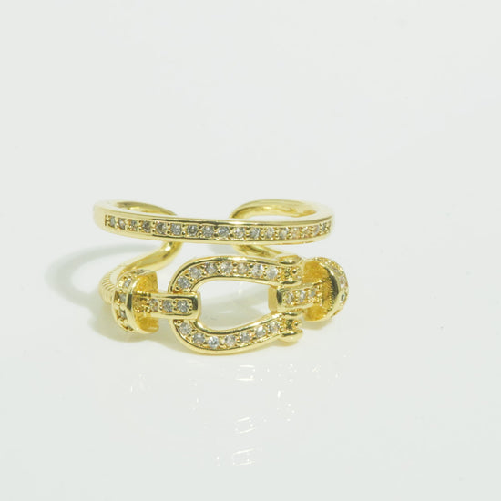 Double Layer Equestrian Buckle Ring | Gold-Tone Layered Ring with Horse-Bit Inspired Buckle Design & Pave CZ Detailing | Chic Statement Fashion Ring