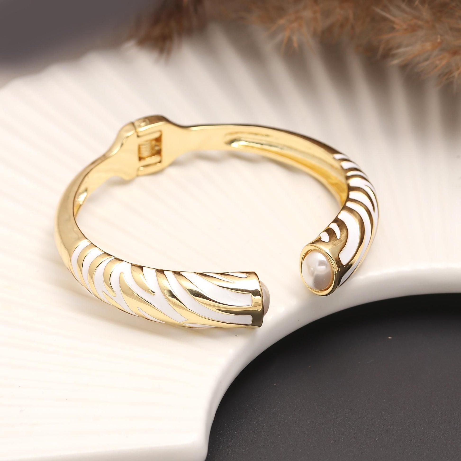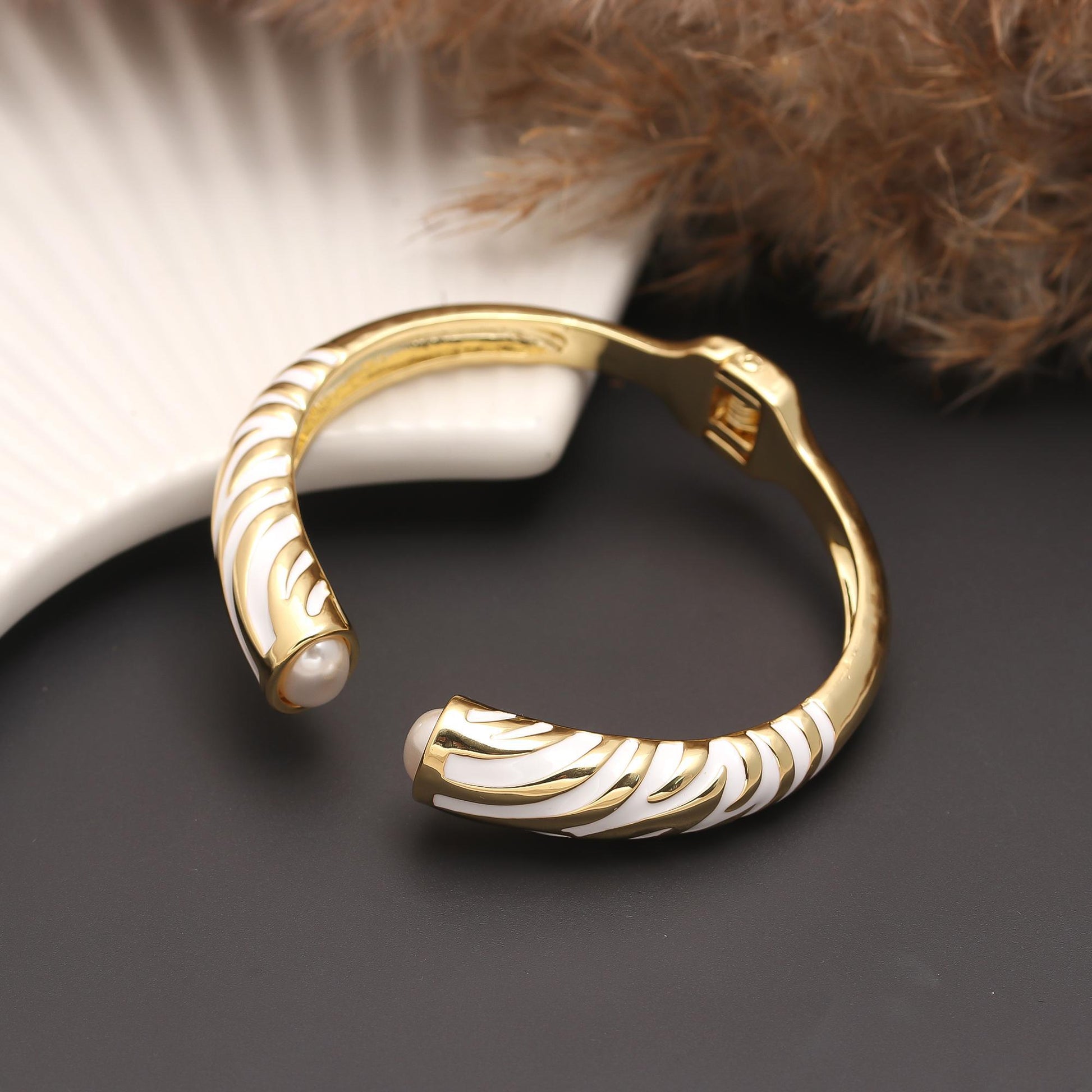 Elegant Gold Cuff Bracelet with White Enamel Accents and Dual Pearl Ends | Adjustable Open Bangle Jewelry for Parties, Gifting, and Everyday Luxury