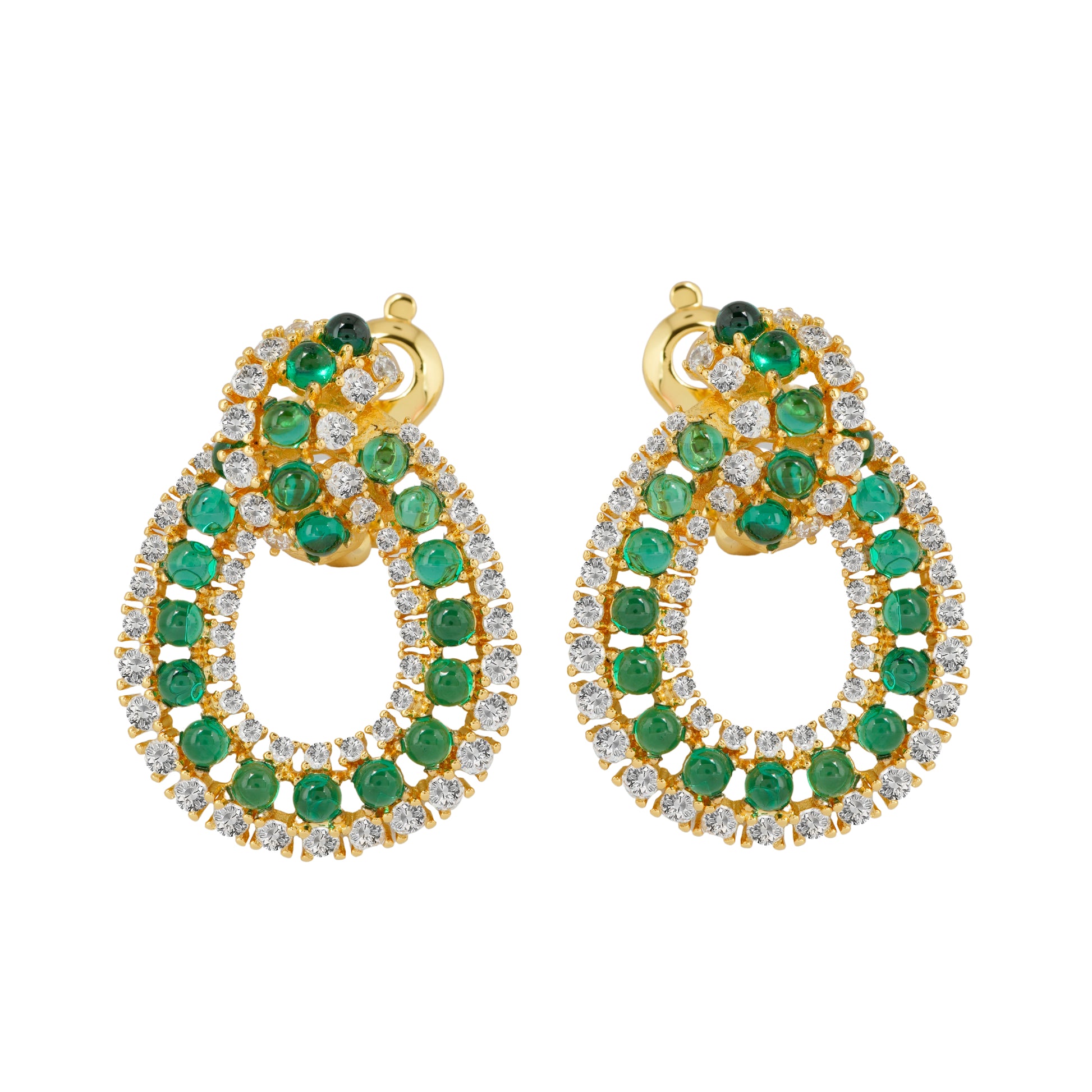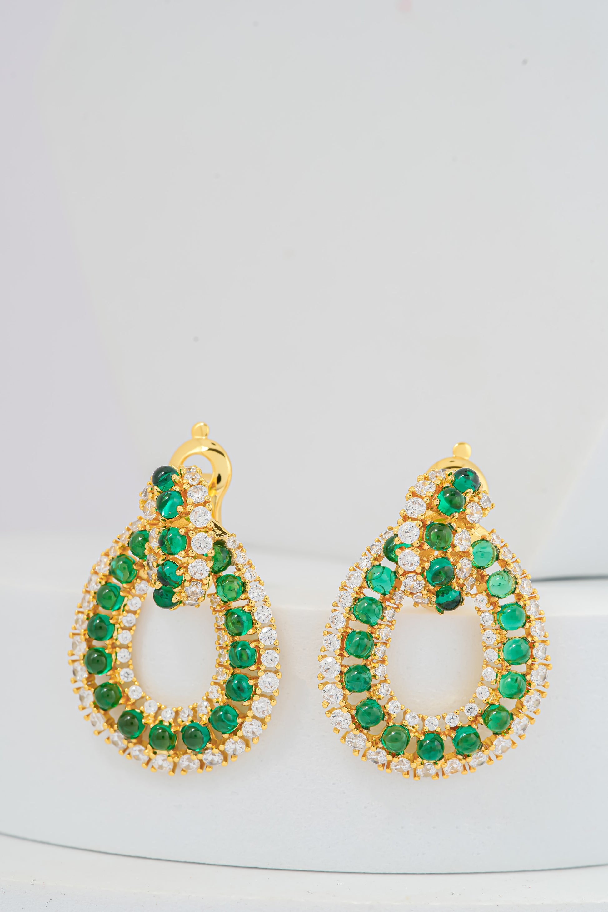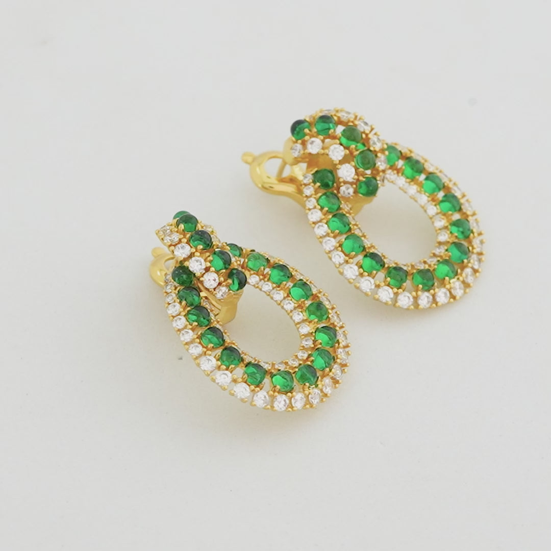 Turn heads with these luxurious emerald green and white loop earrings, crafted to radiate timeless elegance and contemporary charm. Designed in a graceful double-loop silhouette, each earring is encrusted with vivid green stones paired with sparkling diamond-like accents, creating a brilliant play of light with every movement.