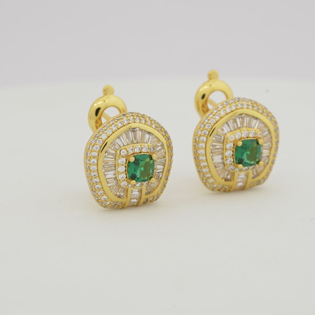 Radiating grandeur and sophistication, these Gold-Plated Earrings are designed with a vivid emerald-green centerpiece, beautifully encircled by layers of baguette and round diamond accents. The structured yet elegant design creates a luxurious statement, making these earrings the perfect blend of traditional craftsmanship and modern elegance.