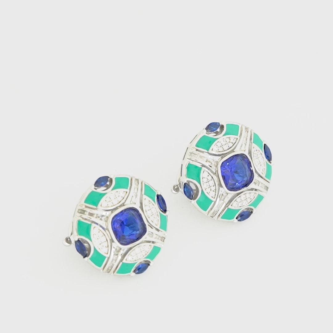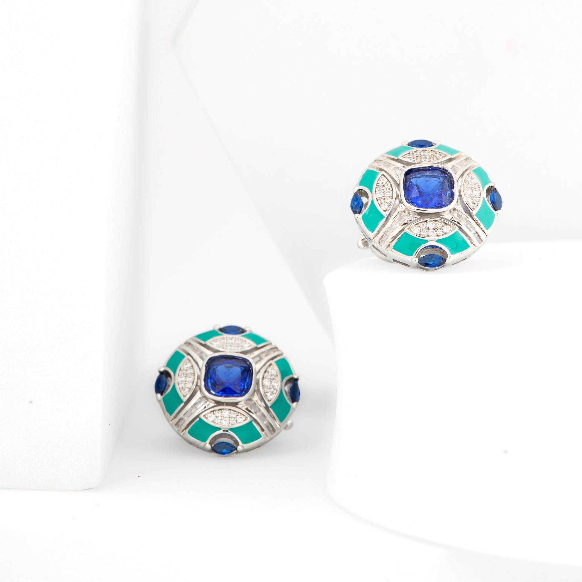 Crafted for the modern woman with a taste for luxury and bold elegance, these Sapphire Enamel Stud Earrings feature a central sapphire-inspired stone framed by a geometric enamel design in emerald green and royal blue. Sparkling diamond-like accents add brilliance, making them a perfect mix of classic charm and contemporary artistry.