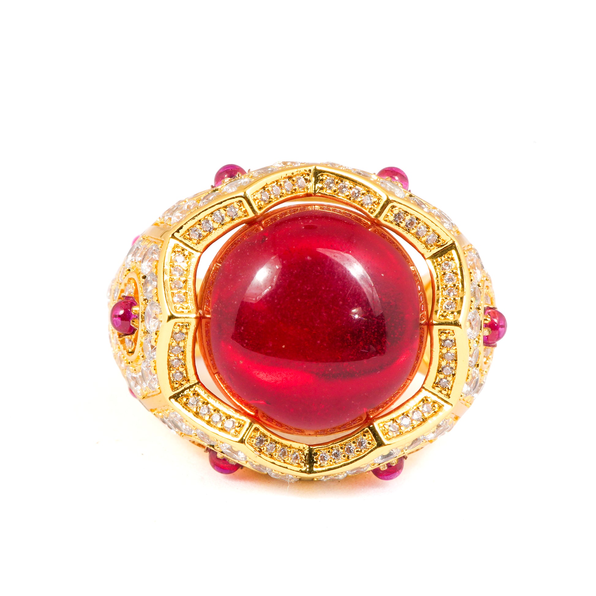 Command attention with this gold finish red cabochon ring, a true statement piece crafted for women who embrace bold elegance and luxury. The fiery red cabochon centerpiece captures the eye instantly, surrounded by pink accent stones and intricate diamond look detailing that add depth and brilliance.