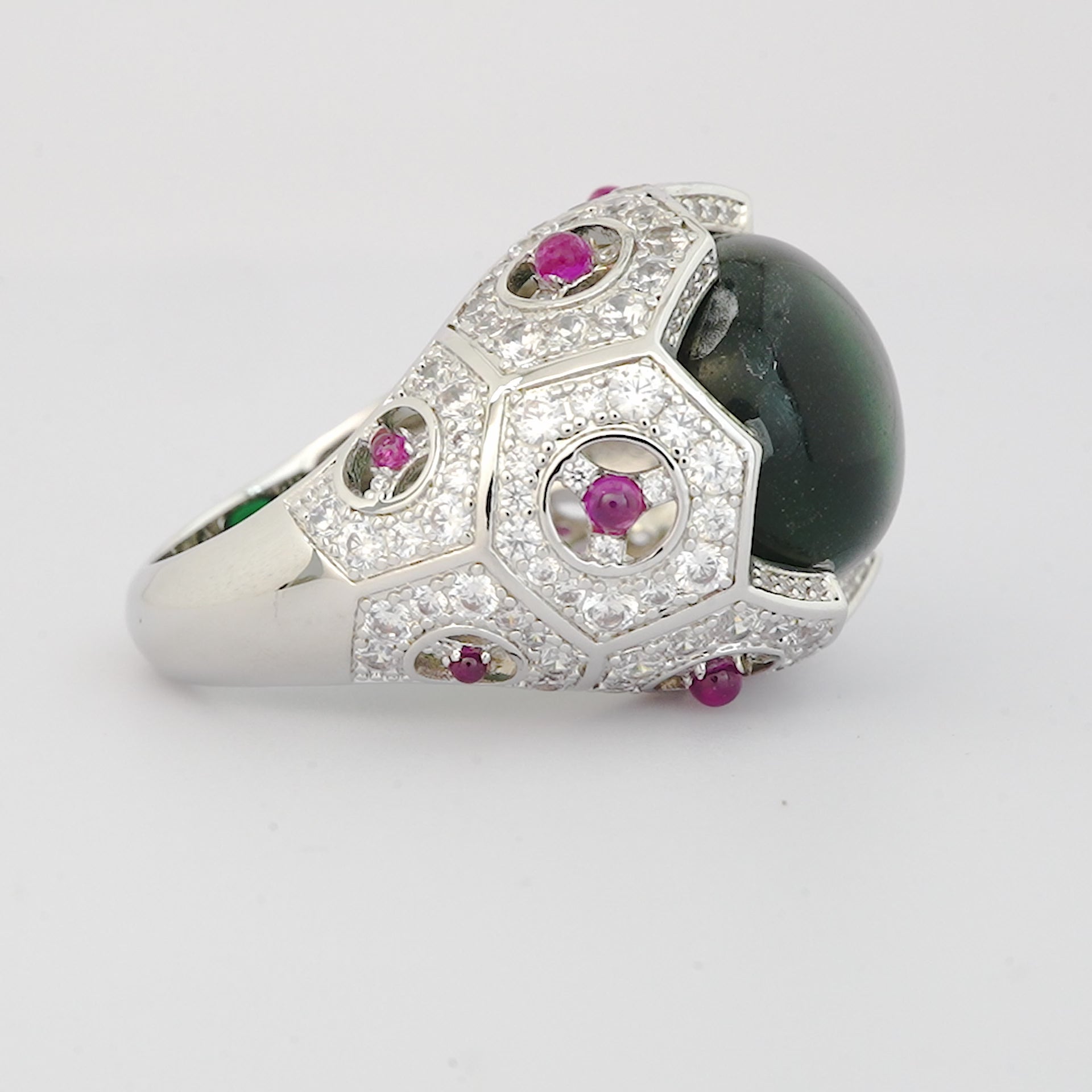 Step into timeless elegance with this silver finish green cabochon stone ring, crafted to be a true statement piece. The large green cabochon at the center exudes a deep, captivating glow, while the pink accent stones and diamond look pavé detailing add a vibrant and glamorous touch.