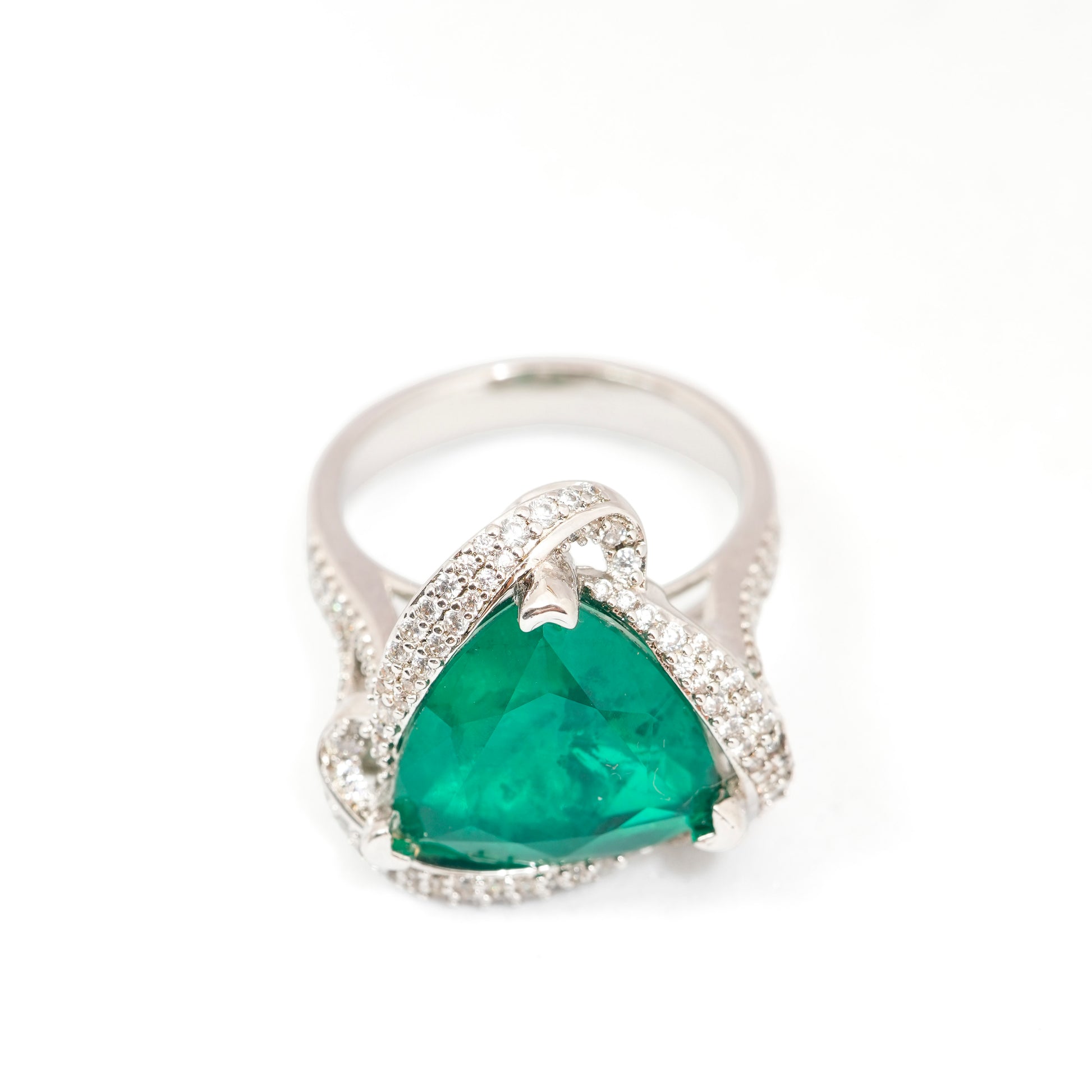 Make a bold statement with this green triangle emerald stone ring in silver finish, featuring a glamorous swirl border studded with diamond look stones. The vivid emerald green centerpiece, cut in a unique triangular shape, creates a fresh and modern vibe while still carrying timeless elegance. The sparkling diamond accents around the swirl add just the right amount of glamour for special occasions.