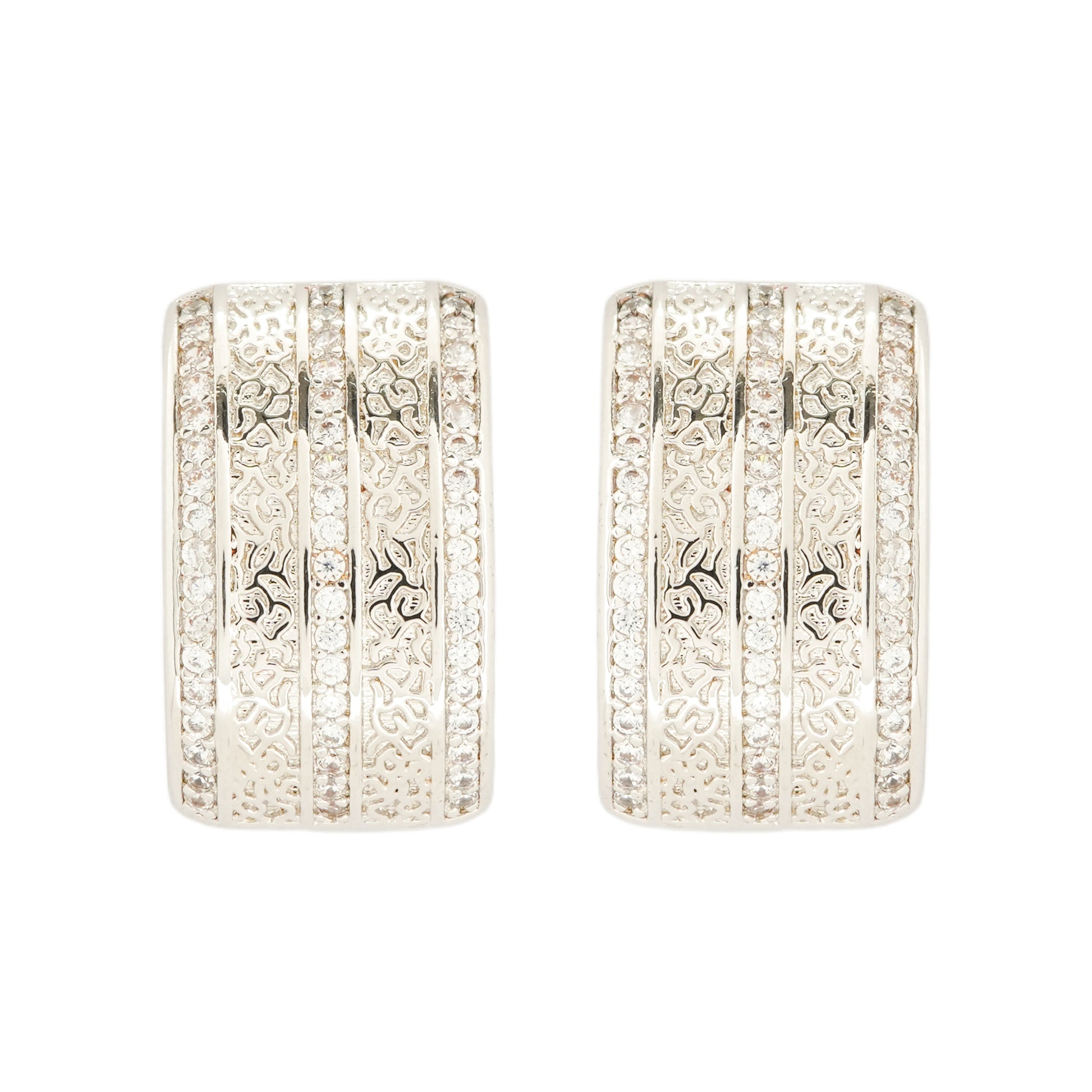 Rectangular Silver-Plated Textured Hoop Earrings with Intricate Layered Diamond-Like Detailing for Modern Elegance