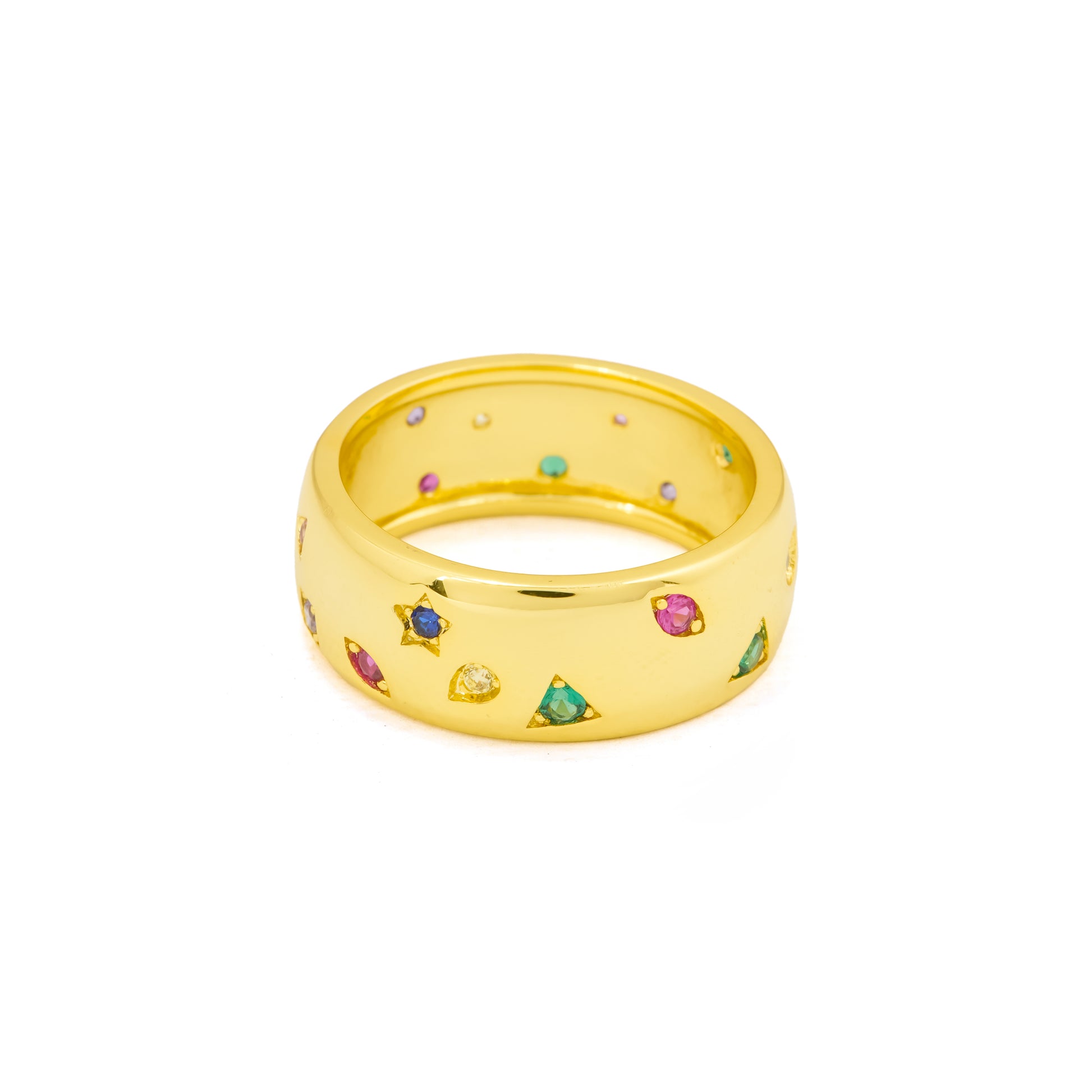 Add a touch of playful elegance to your look with this gold finish band ring, adorned with multi-colored gemstones in varying shapes and hues. The smooth polished surface of the band enhances the brilliance of each stone, making it a versatile piece that blends modern minimalism with vibrant charm.