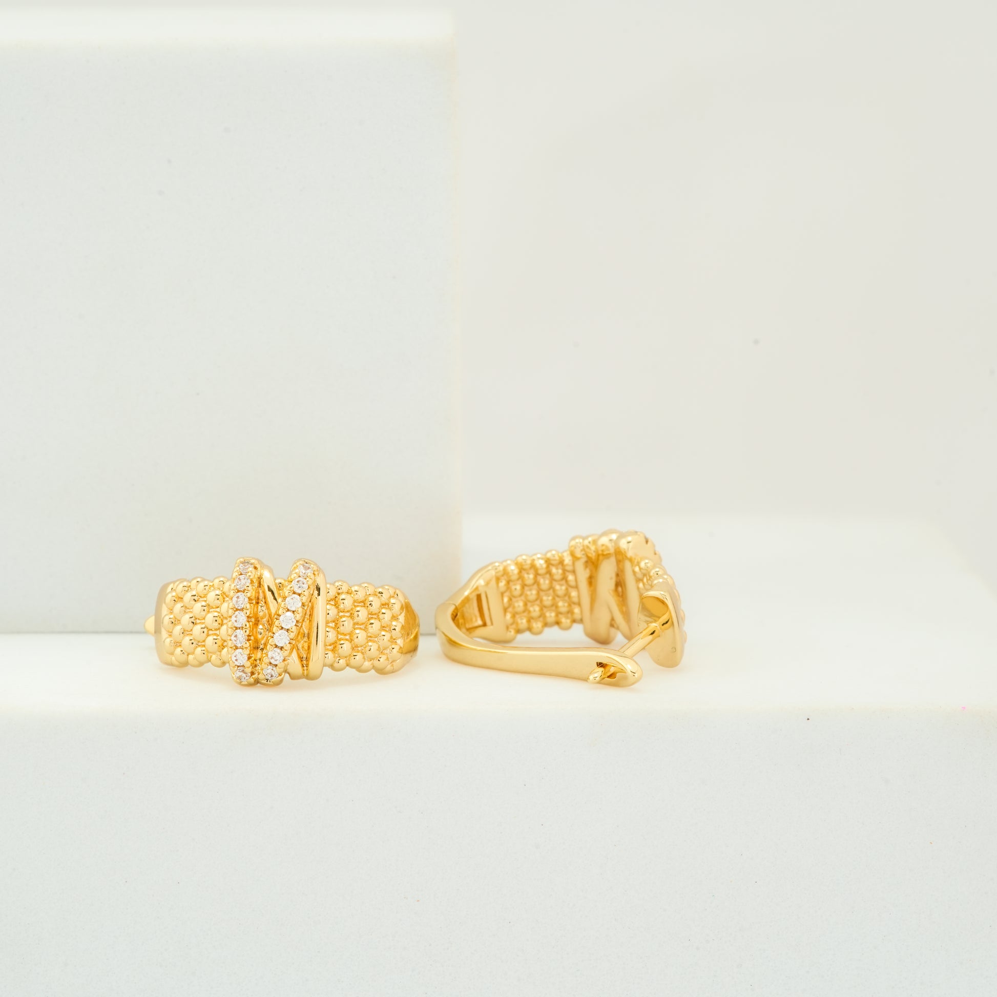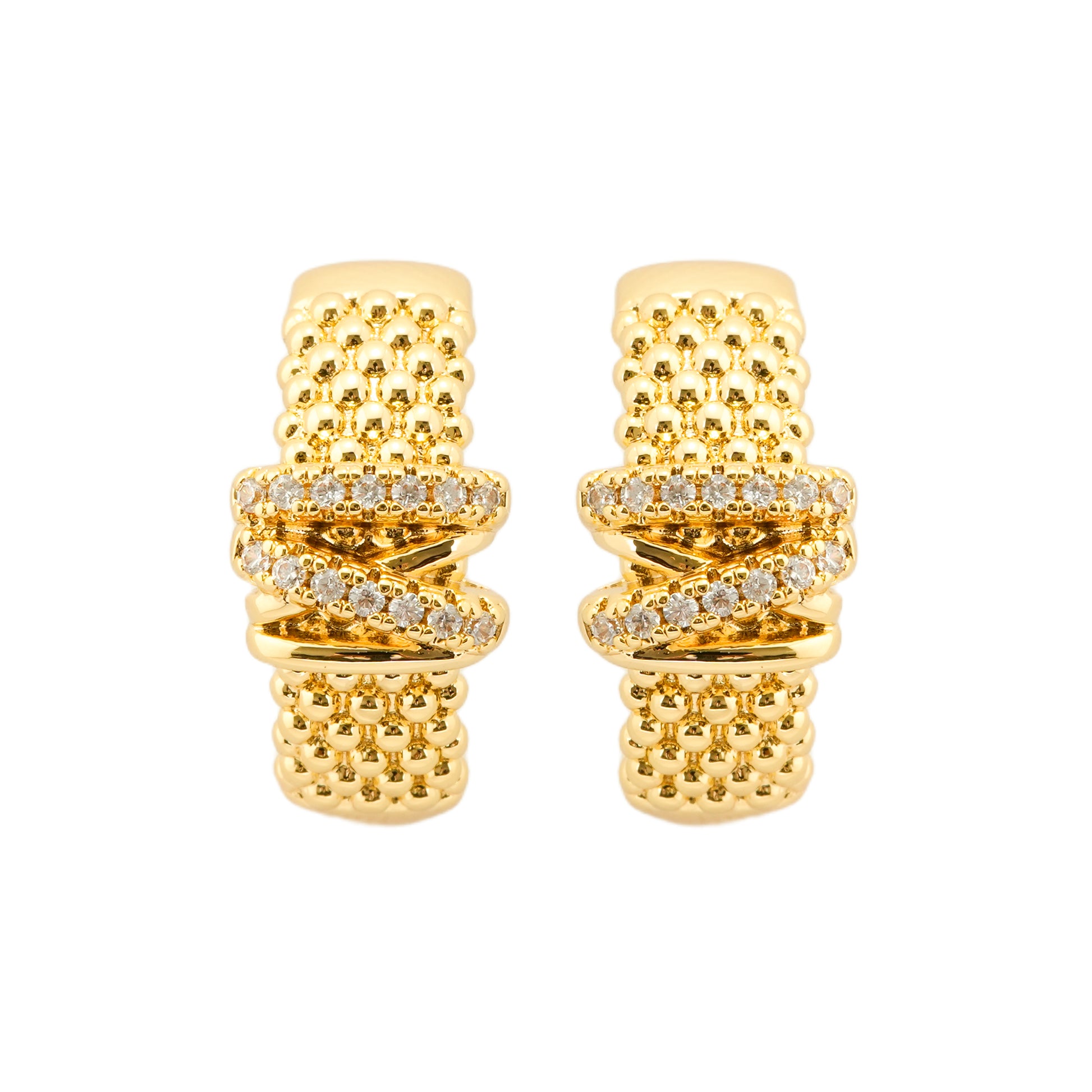 Elevate your jewelry collection with these bold yet refined gold-plated hoop earrings. Featuring a textured beaded surface, they are accented by a central crisscross band studded with diamond-like stones, creating a perfect fusion of sparkle and sophistication. Designed to add depth and shine, these earrings make an excellent choice for formal evenings, festive celebrations, or stylish everyday wear. Their durable clasp ensures comfort and security, making them as practical as they are glamorous.