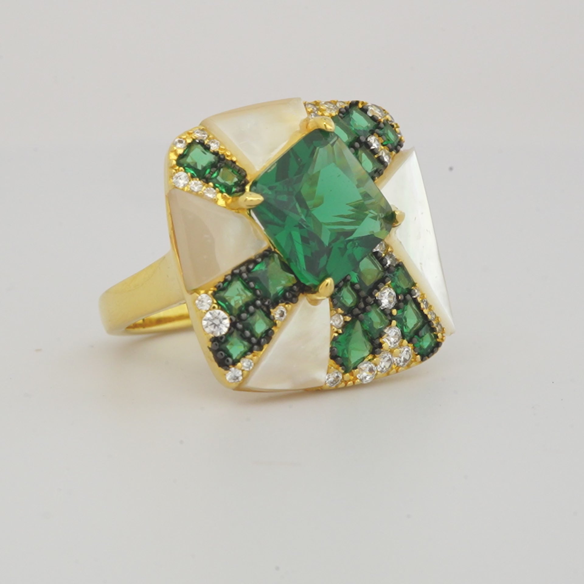 ● Gold finish statement ring with green emerald stones