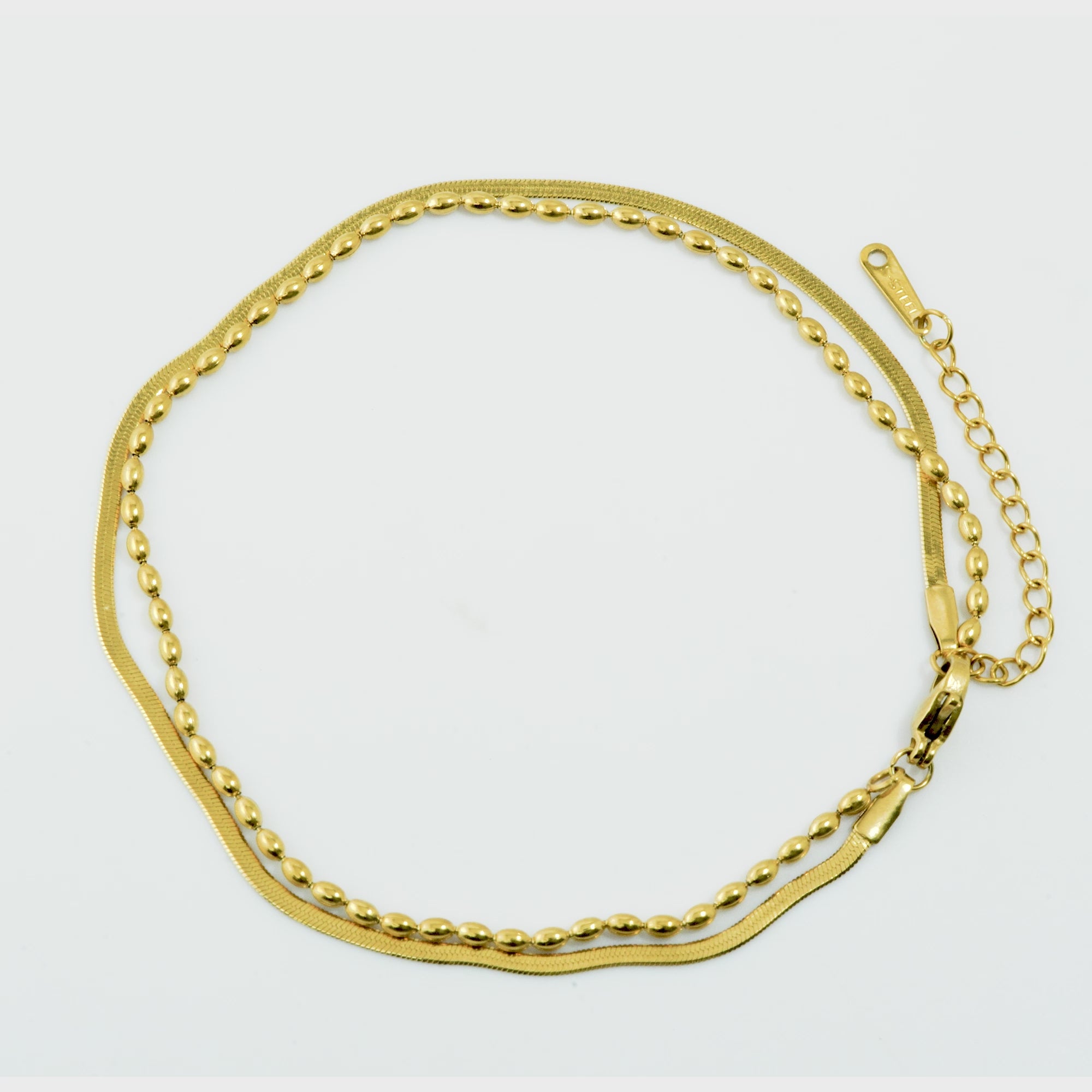 The snake chain lies flat against the skin, offering a molten, mirror-like shine that catches light beautifully with every step. Complementing it is a dainty chain adorned with tiny, evenly spaced bead accents, adding a soft classic charm to the sleek silhouette.