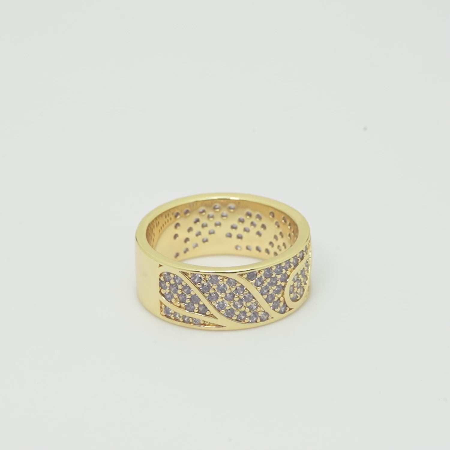 This broad band gold finish ring for women is a refined piece of fashion jewelry crafted to bring elegance and sophistication to your style. The ring features a wavy patterned design highlighted with sparkling crystals, giving it a graceful yet bold appeal. Its wide band design makes it a perfect statement ring for both traditional and modern looks.