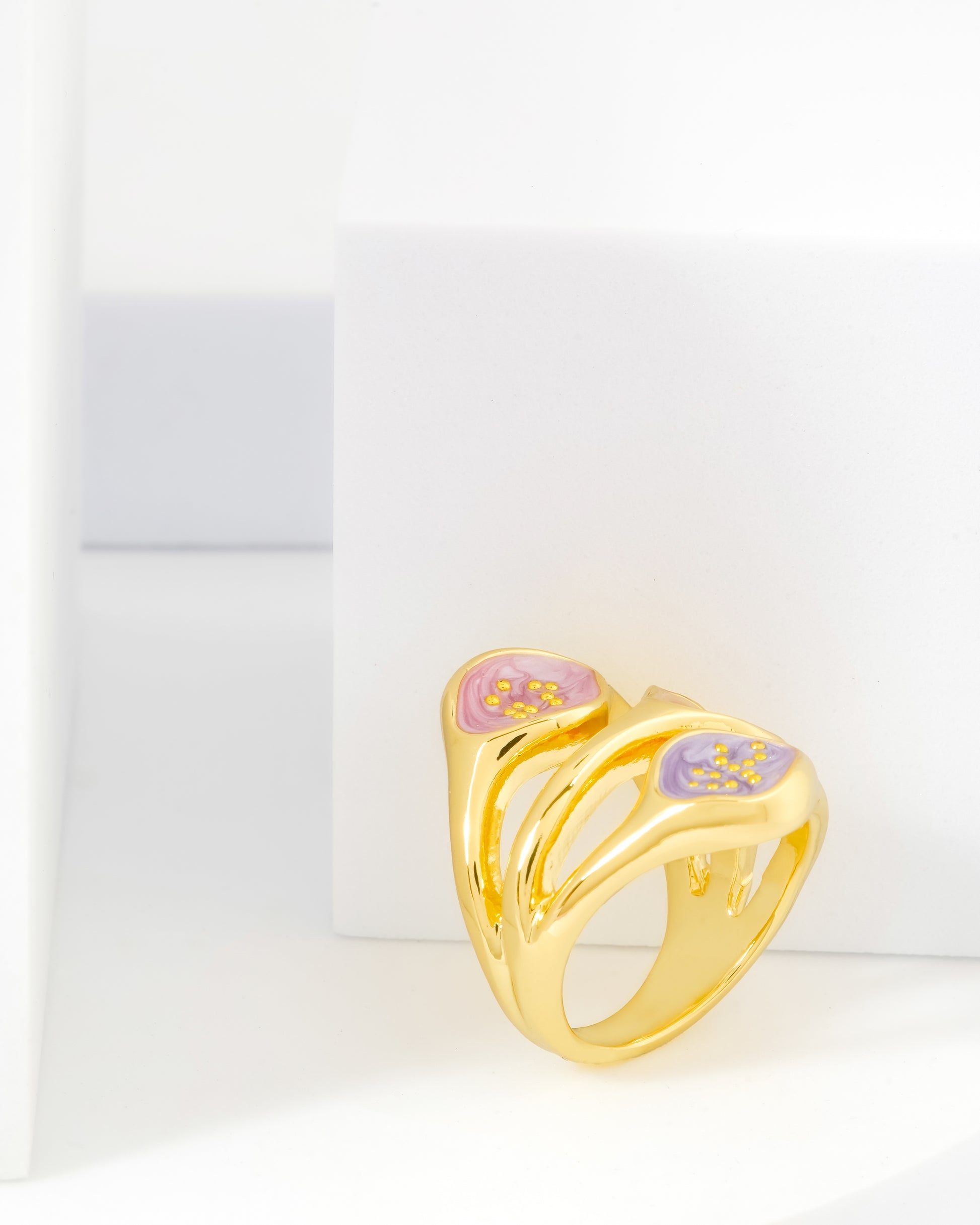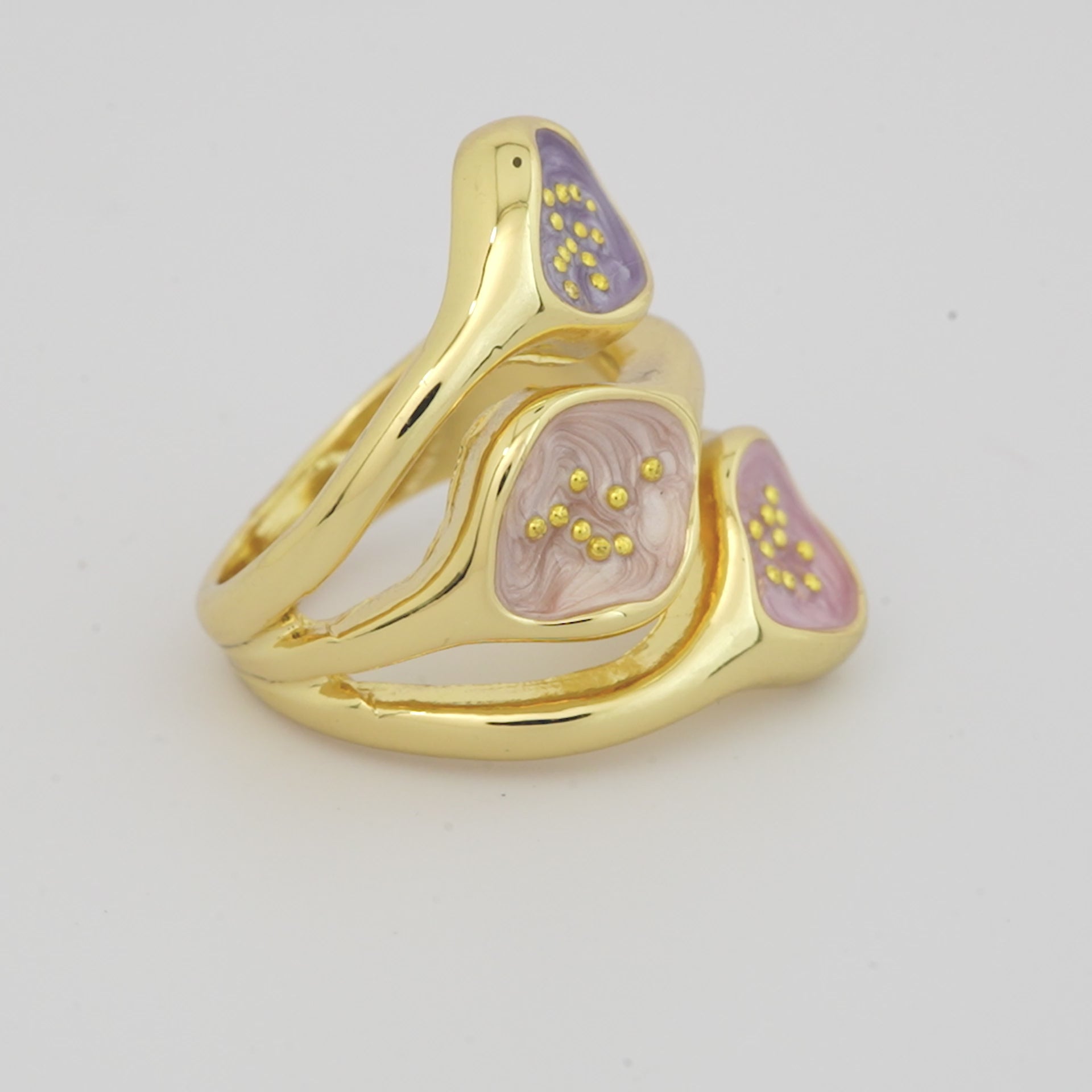 ● Gold finish statement ring with pastel pink and lavender enamel accents
