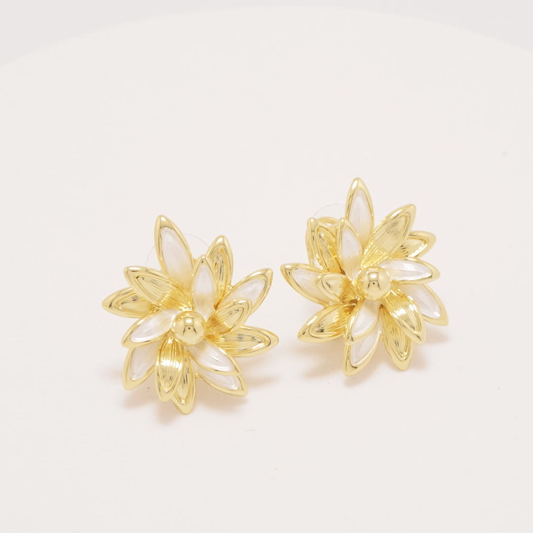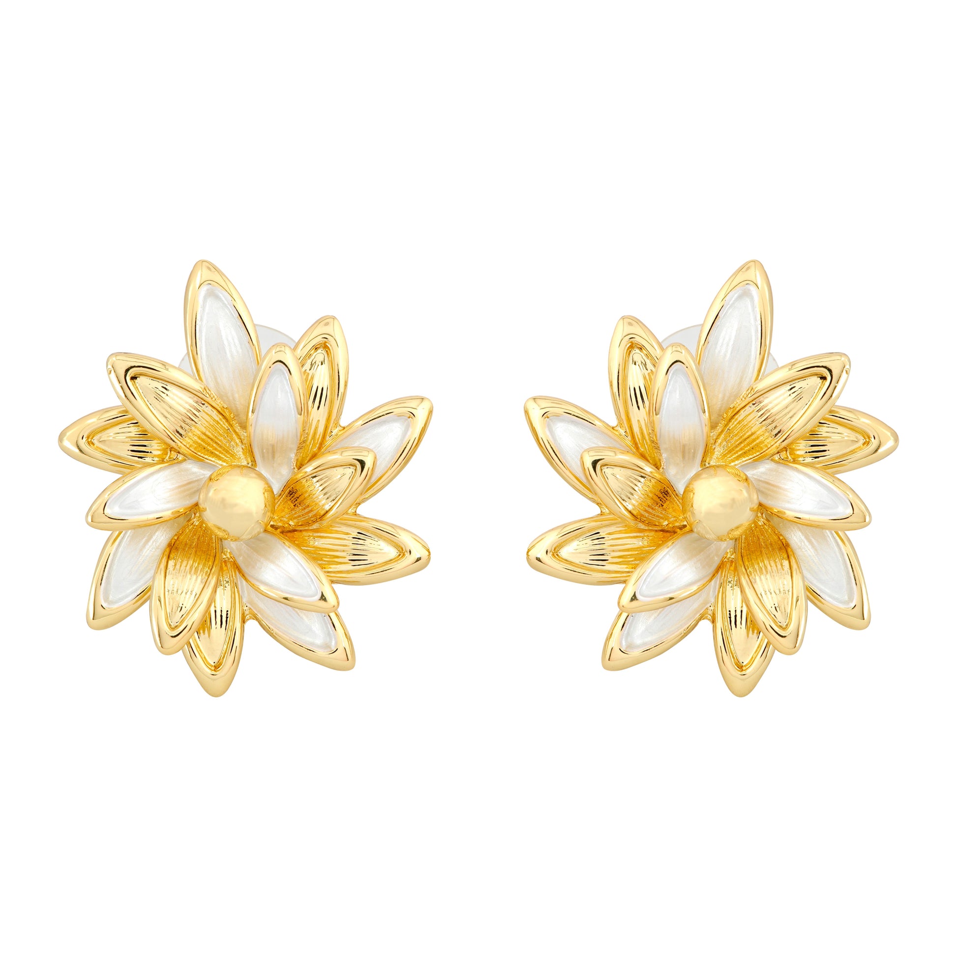 Exquisite Gold-Plated Floral Bloom Earrings Featuring Layered White Enamel Petals and Polished Golden Accents for Sophisticated Charm