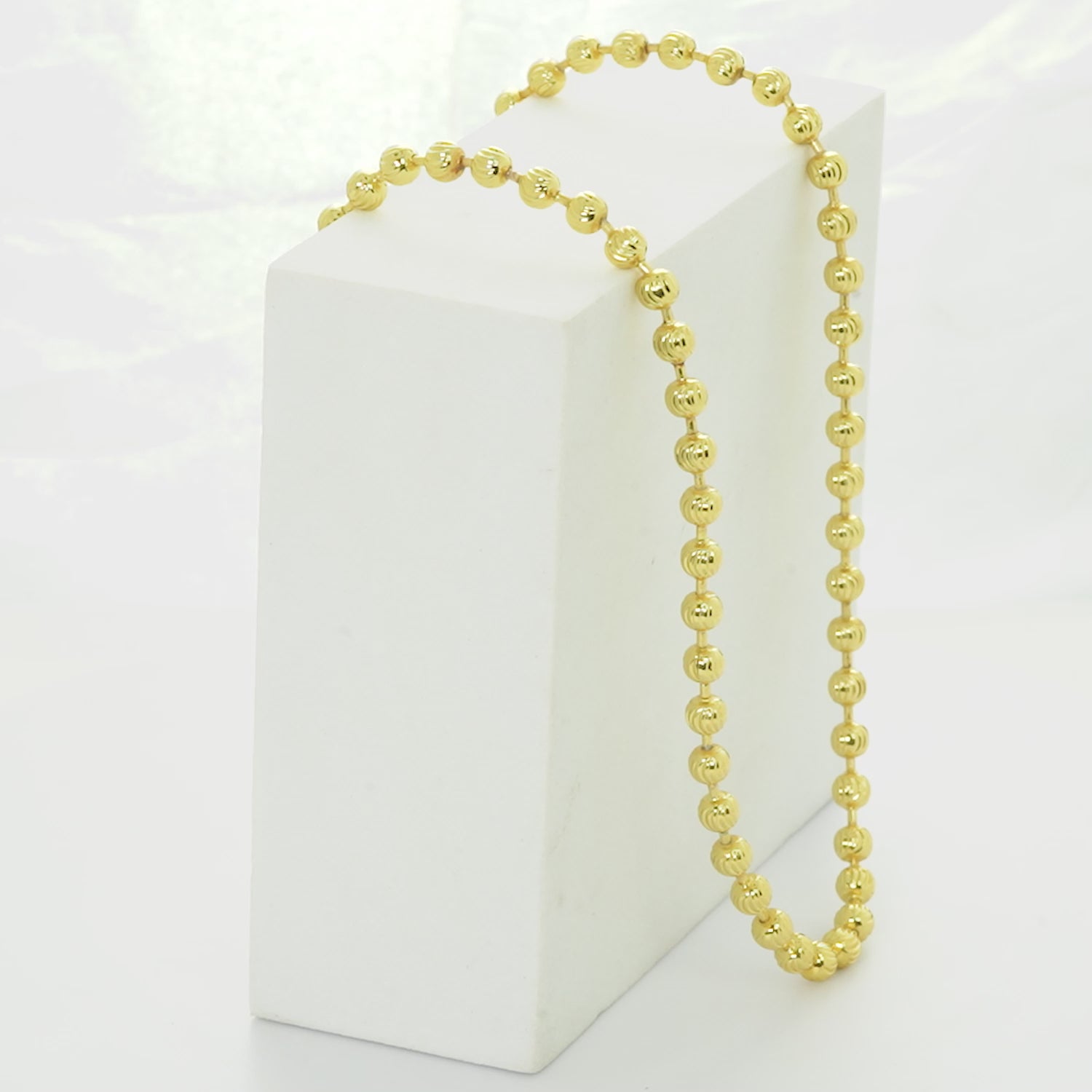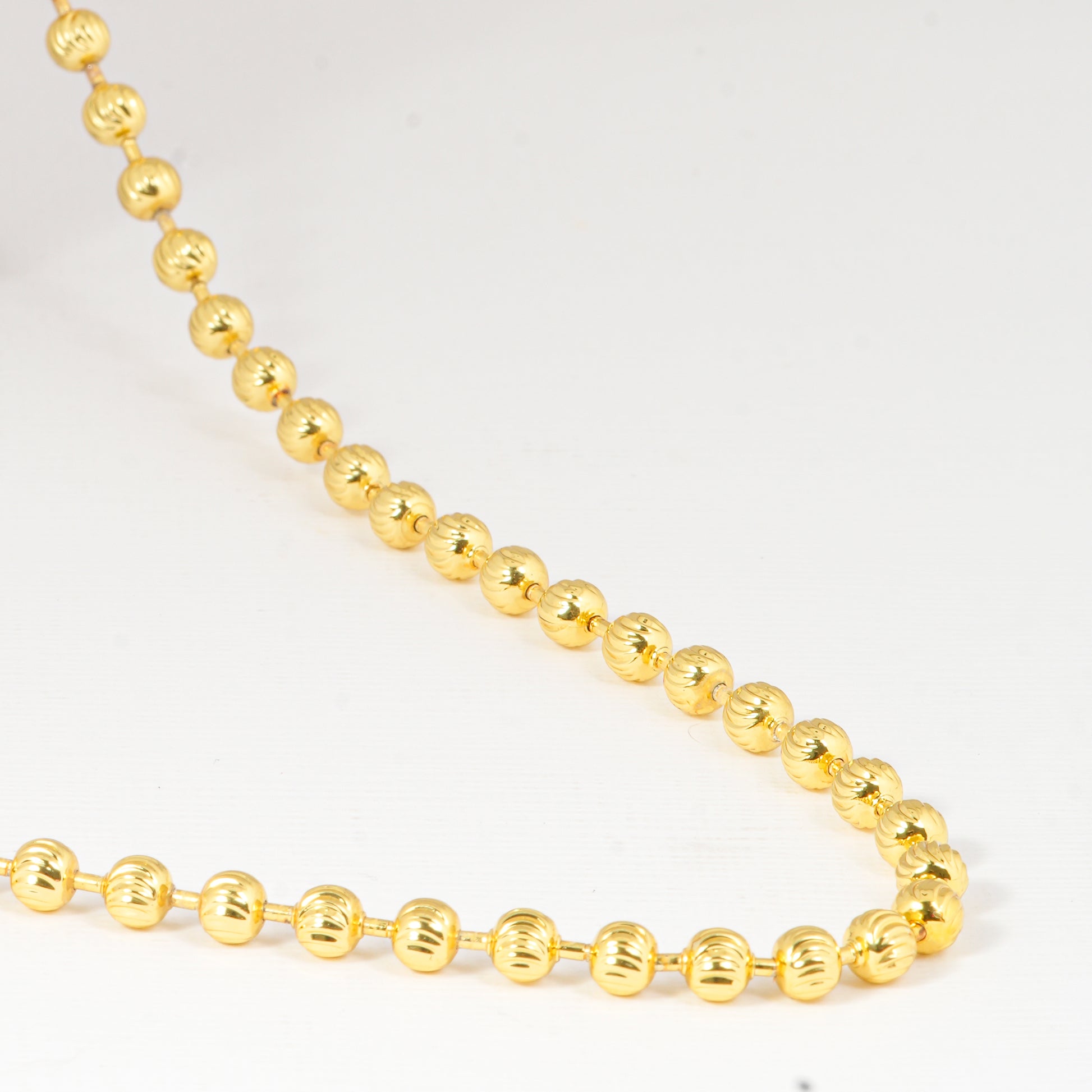 Elevate your style with this gold beaded chain necklace, designed with perfectly polished round beads that exude elegance and sophistication. The uniform bead pattern creates a timeless look, making it an ideal accessory for both traditional and contemporary ensembles.