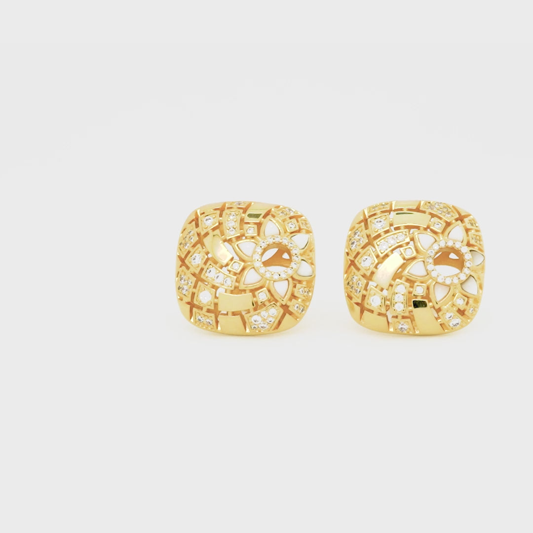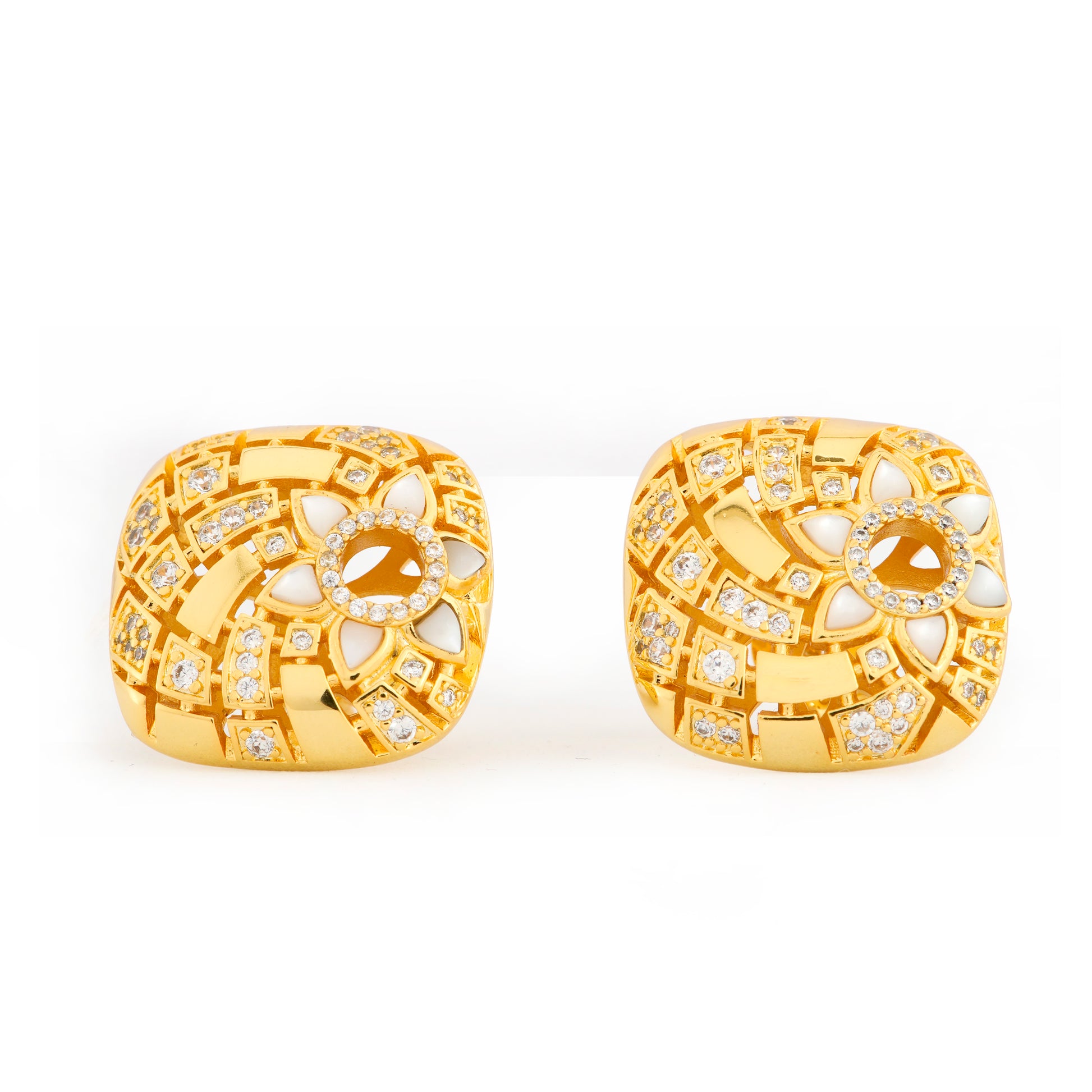 Add a touch of timeless elegance to your jewelry collection with these Gold-Plated Floral Stud Earrings, beautifully designed with a delicate blend of floral motifs and geometric lattice patterns. The brilliant diamond accents shine gracefully against the warm golden finish, creating a luxurious yet versatile accessory.