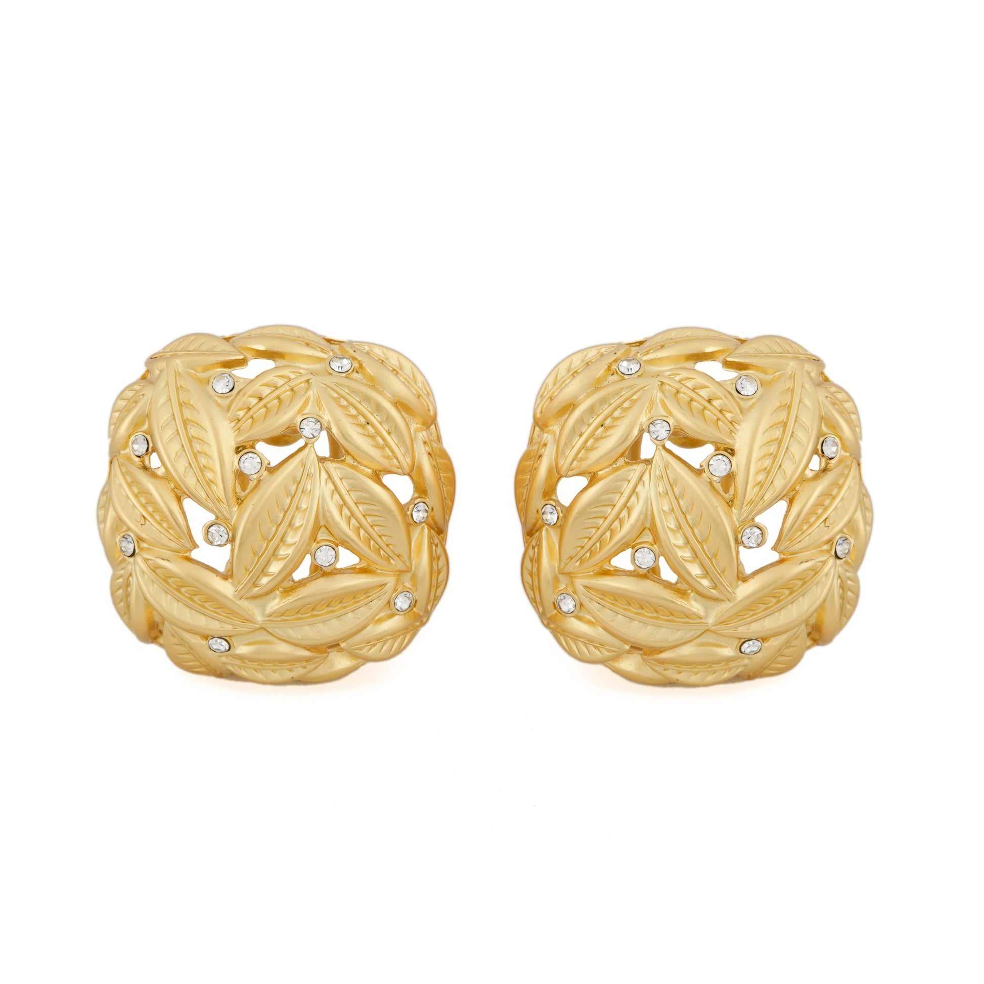Intricately designed with a woven leaf motif, these gold-plated earrings blend the richness of traditional artistry with modern elegance. The delicate leaf patterns are enhanced with subtle diamond-like accents, adding sparkle to their organic charm. Their bold yet refined structure makes them a statement piece that works beautifully with ethnic ensembles as well as contemporary outfits. Ideal for festive occasions, weddings, or evening gatherings, these earrings highlight craftsmanship and heritage in every detail.