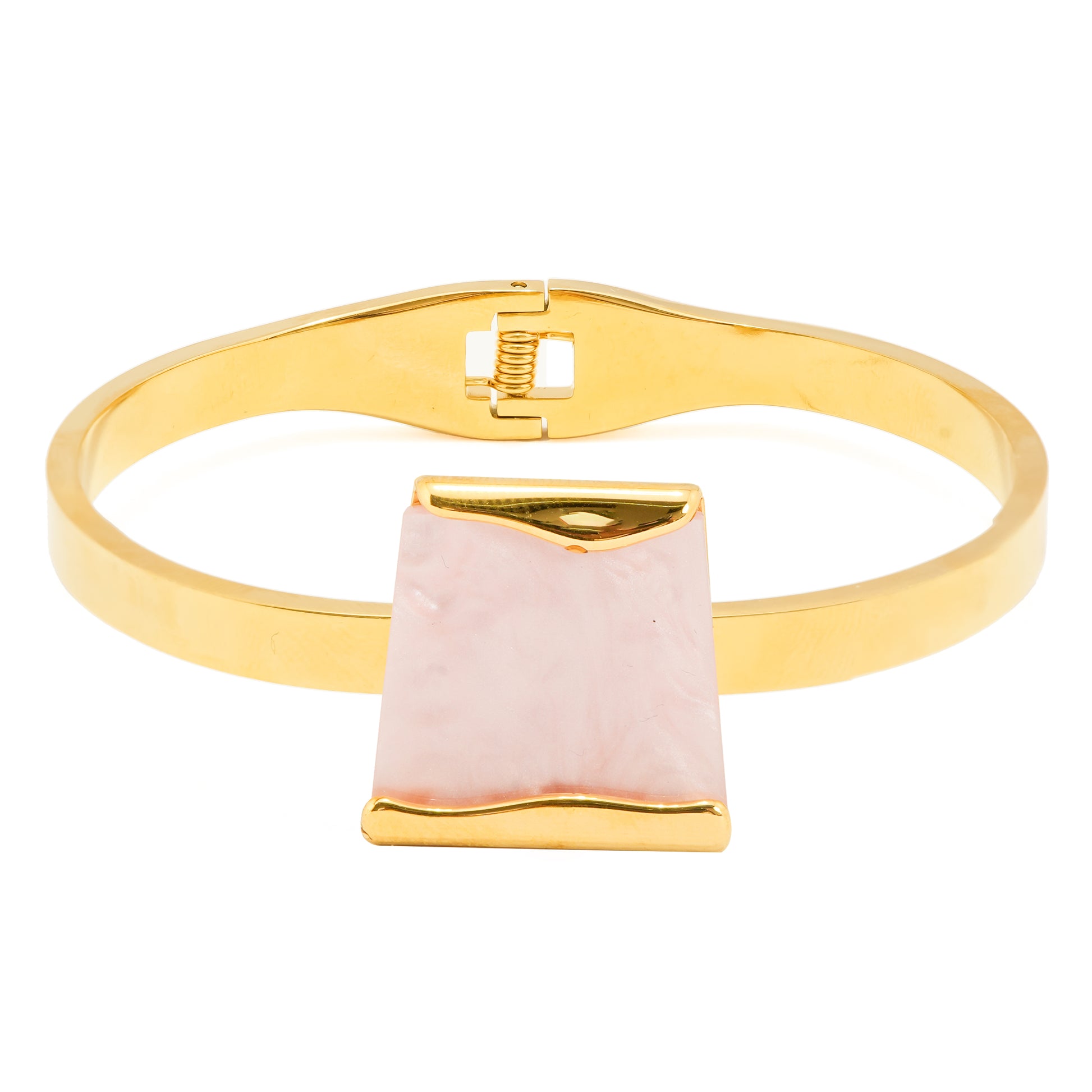 Add a touch of soft femininity and modern elegance to your collection with this Gold Plated Pink Stone and Pearl Jewelry Set. The set includes a statement bracelet, pendant necklace, matching earrings, and a coordinating ring — all designed with smooth pink stone inlays framed in polished gold plating and accented with lustrous pearls.
