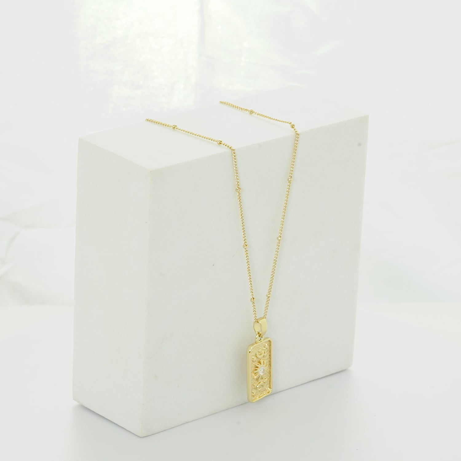 Celebrate the beauty of the cosmos with this Gold Plated Rectangular Sun and Moon Pendant Necklace, a celestial-inspired jewelry piece crafted for modern women who adore elegance with meaning. The rectangular pendant is intricately designed with symbolic engravings of the sun, moon, and stars, beautifully centered with a luminous white stone that adds a radiant focal point.