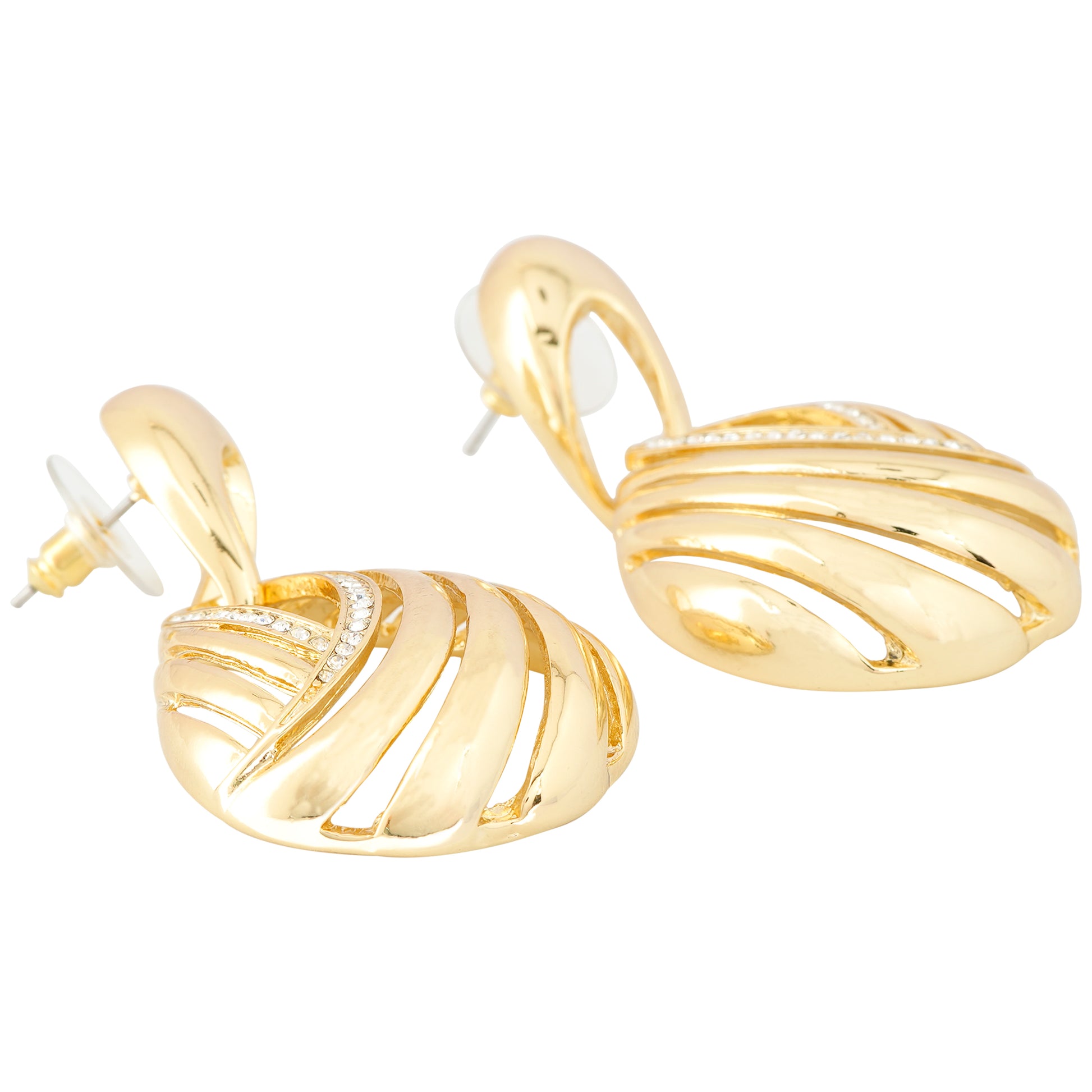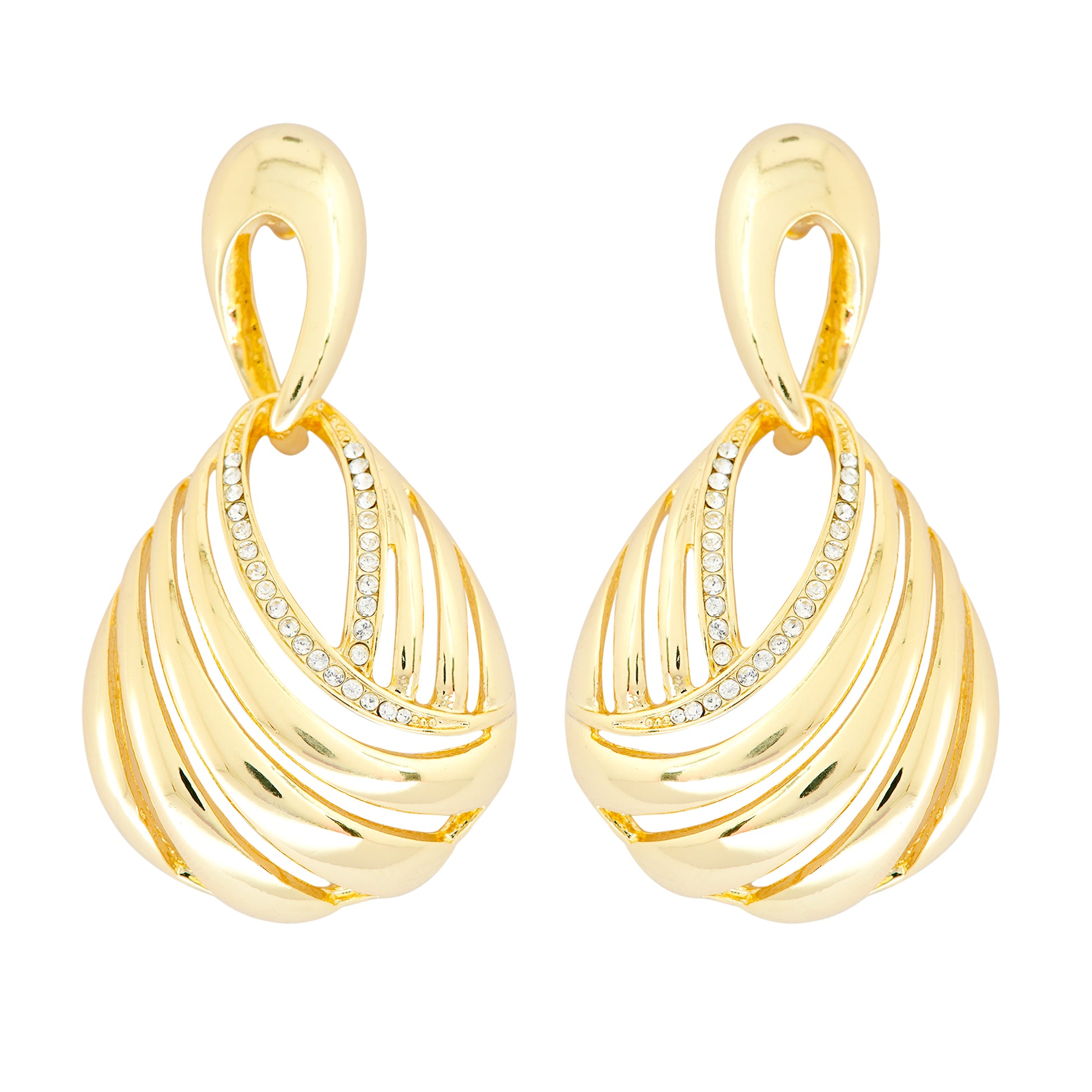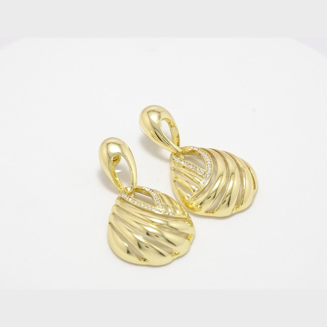 A celebration of timeless glamour, these gold-plated teardrop earrings feature a beautifully sculpted swirl design that flows gracefully to create a sense of movement and fluidity. At the center, delicate diamond-like accents trace the curves, adding just the right amount of sparkle for an elevated finish. Their luminous gold sheen and elegant silhouette make them the perfect blend of tradition and modern sophistication. Designed for the woman who loves to shine effortlessly, these earrings are a versatile statement piece ideal for festive occasions, cocktail evenings, or even refined daywear.