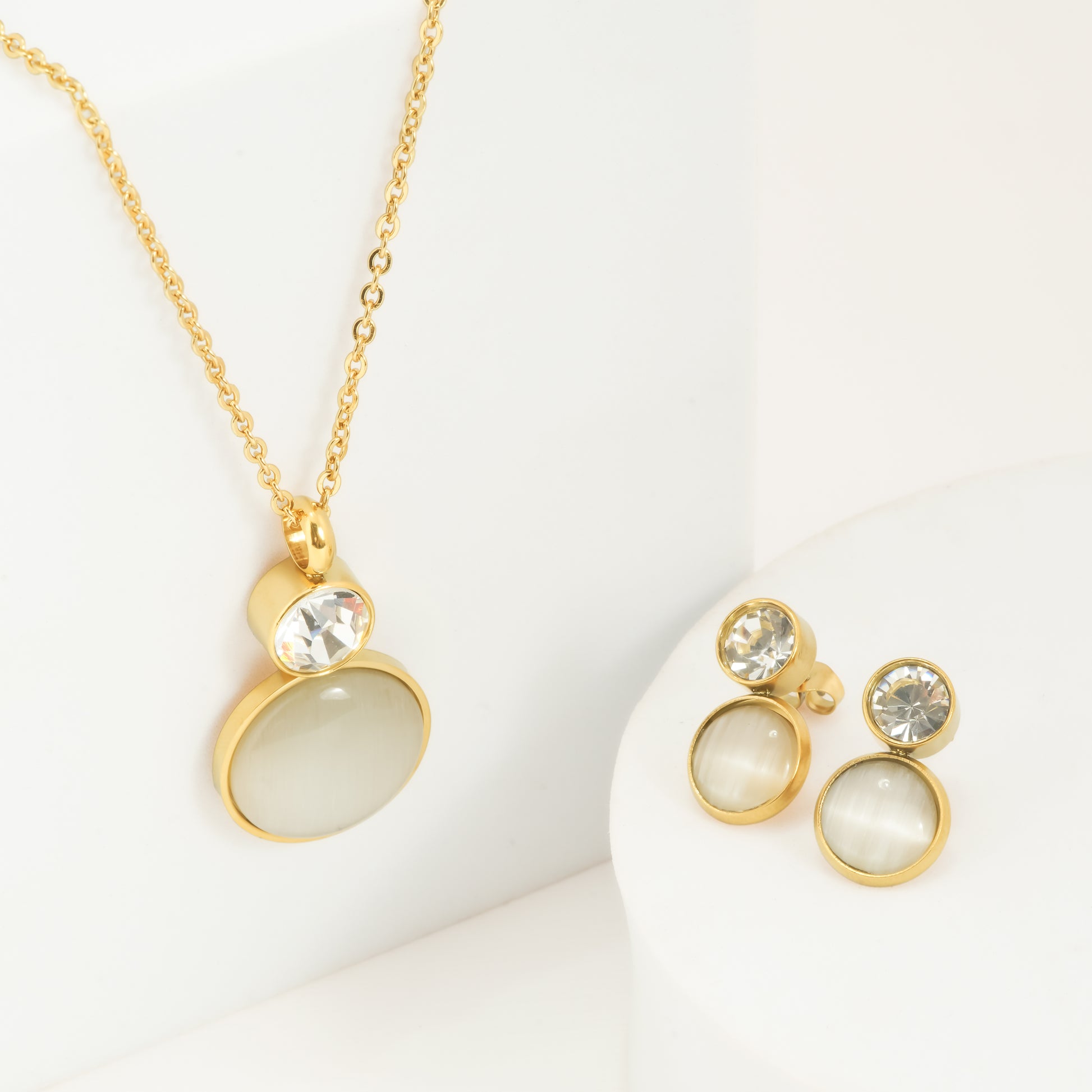 Experience elegance in its most versatile form with this Gold Plated White Stone Jewelry Set, thoughtfully designed to bring together all your favorite essentials in one luxurious box. The set includes a classic bracelet, a delicate pendant necklace, matching stud earrings, and a statement ring — all beautifully adorned with luminous white stones framed in polished gold plating.