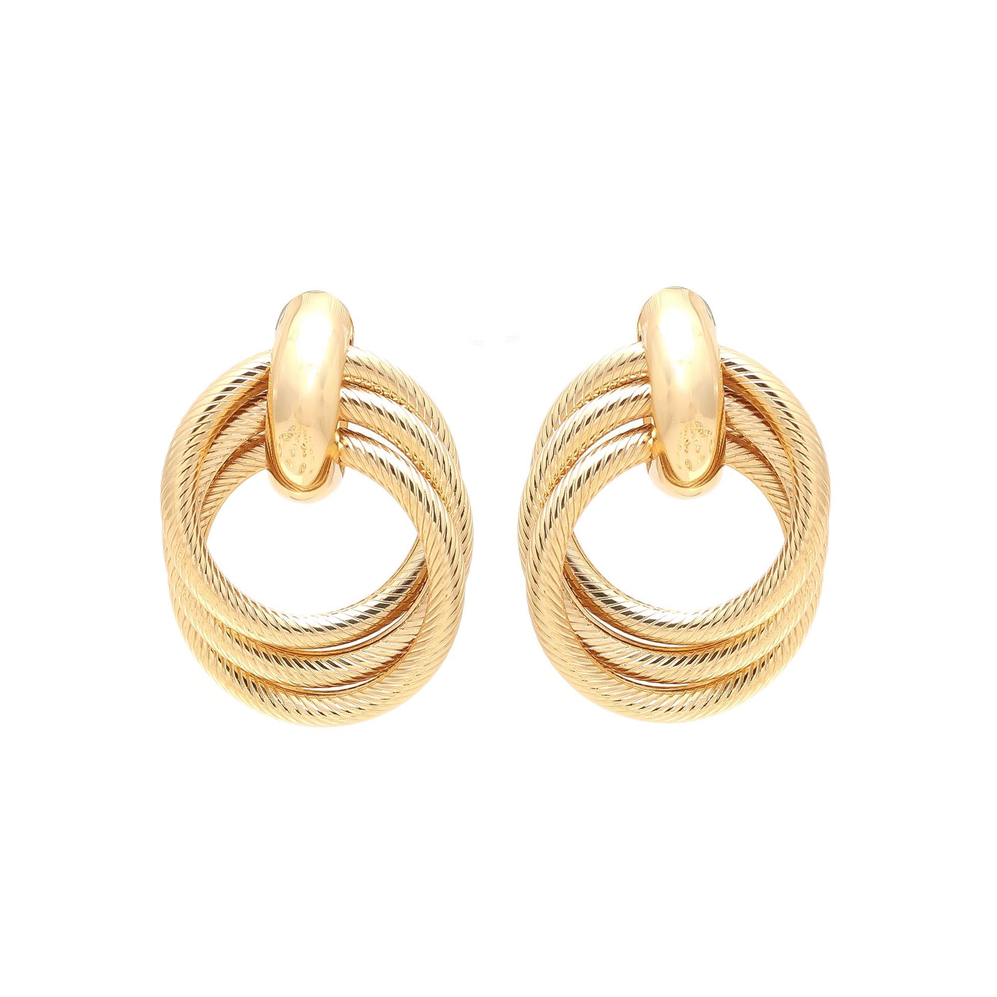 Modern Gold-Plated Interlocking Circle Earrings with Textured Rope Detailing, Polished Top Accent, and Contemporary Minimalist Design for Versatile Style