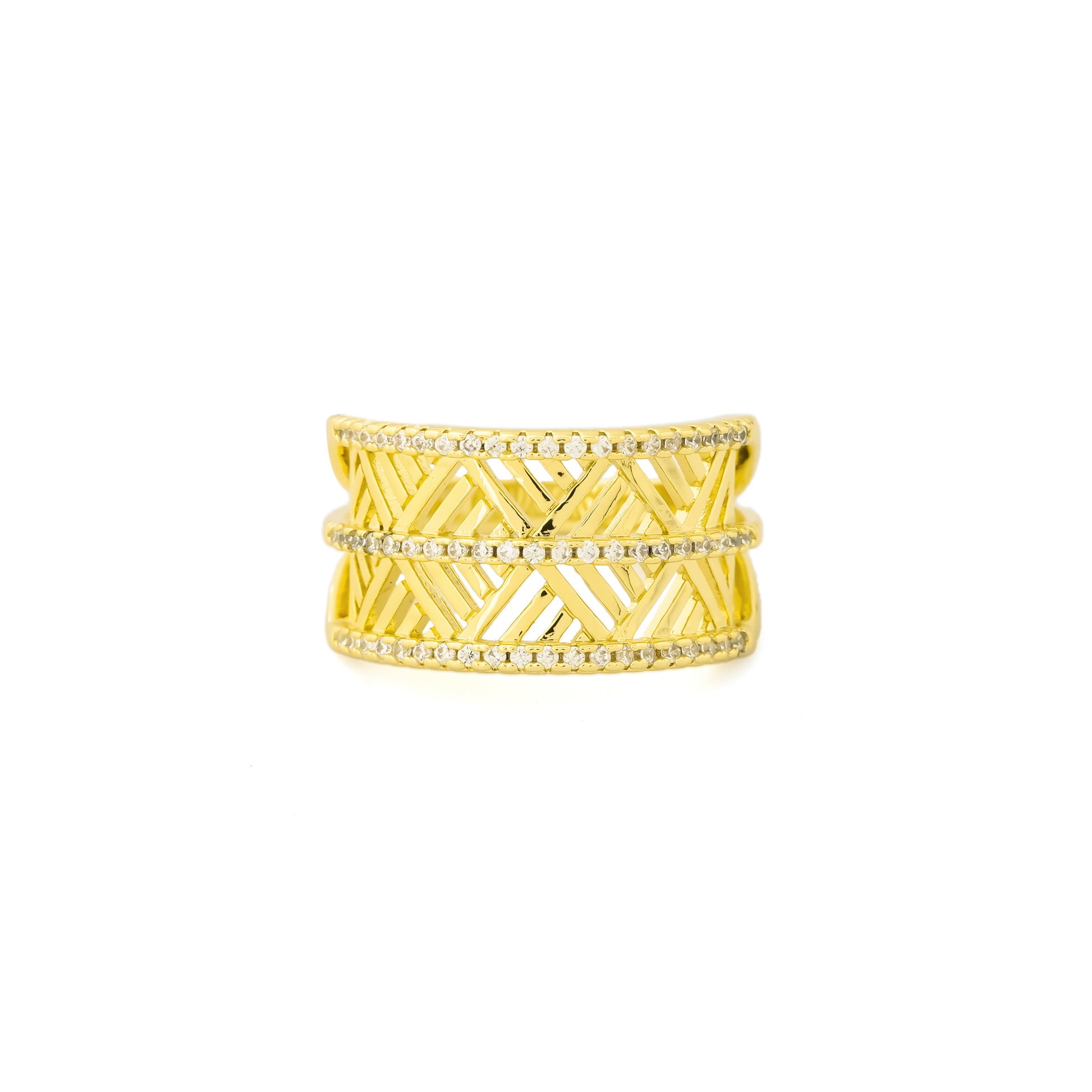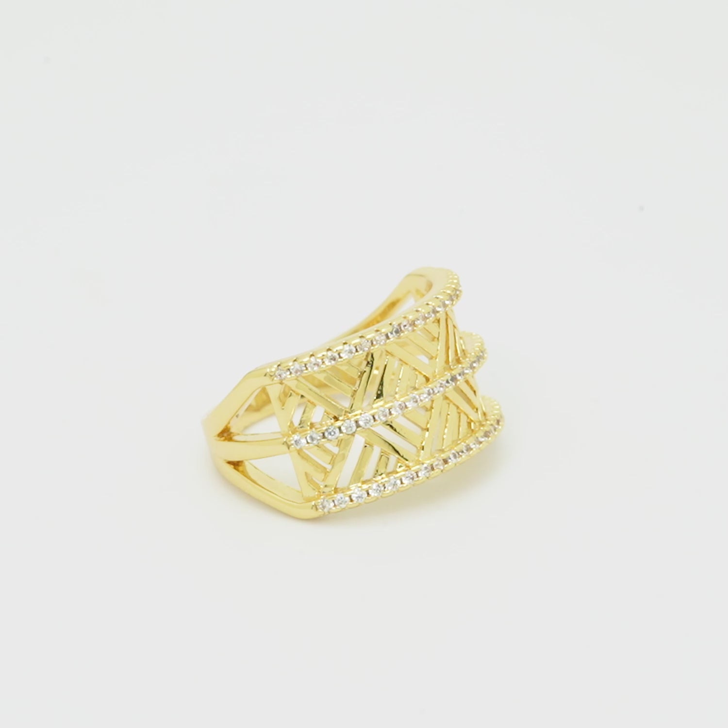 This geometric pattern gold finish ring for women is a striking piece of fashion jewelry that combines bold style with elegance. Designed with a broad band structure featuring intricate geometric cutwork, the ring is further highlighted with sparkling crystal accents for a touch of shine and sophistication.