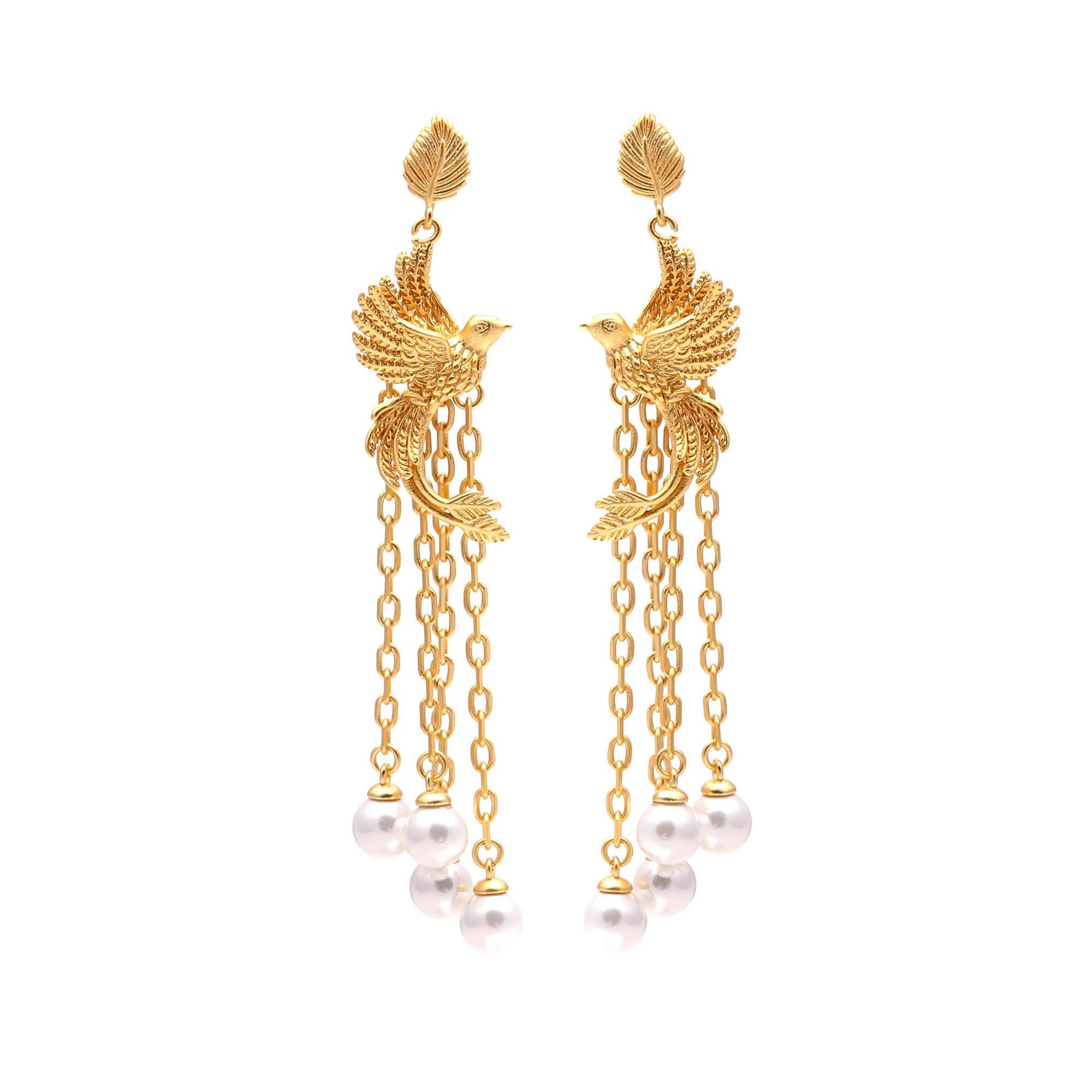 Embrace artistic storytelling with these unique, asymmetric gold-toned drop earrings. One earring features a detailed songbird in flight trailed by cascading chains and pearls, while the other showcases a delicate, ornate birdcage motif. This whimsical yet luxurious set is perfect for those who want to make a highly personal and creative fashion statement at their next special occasion.
