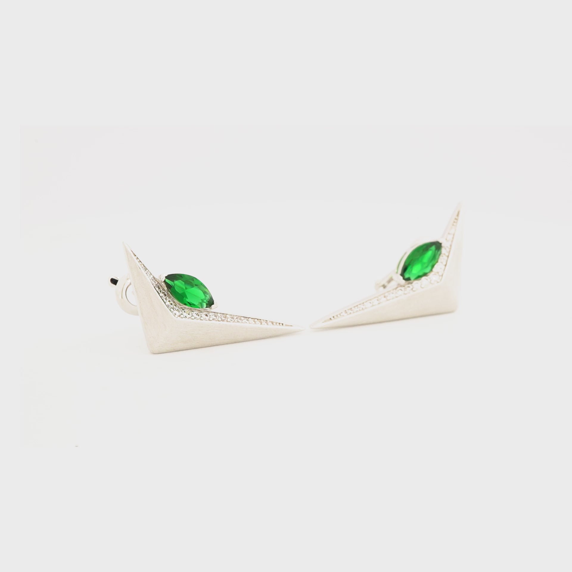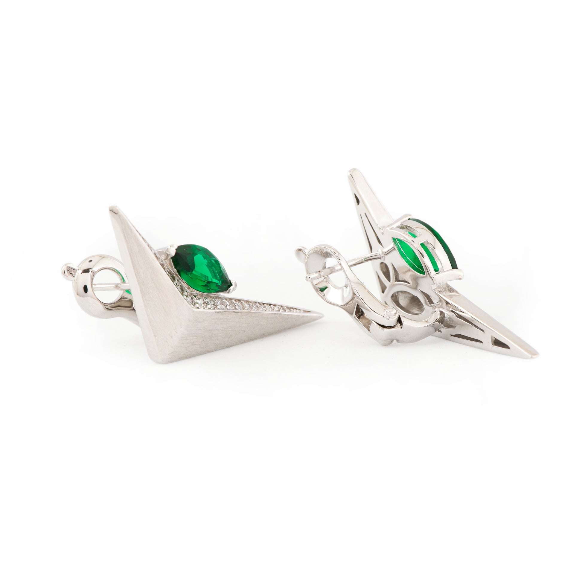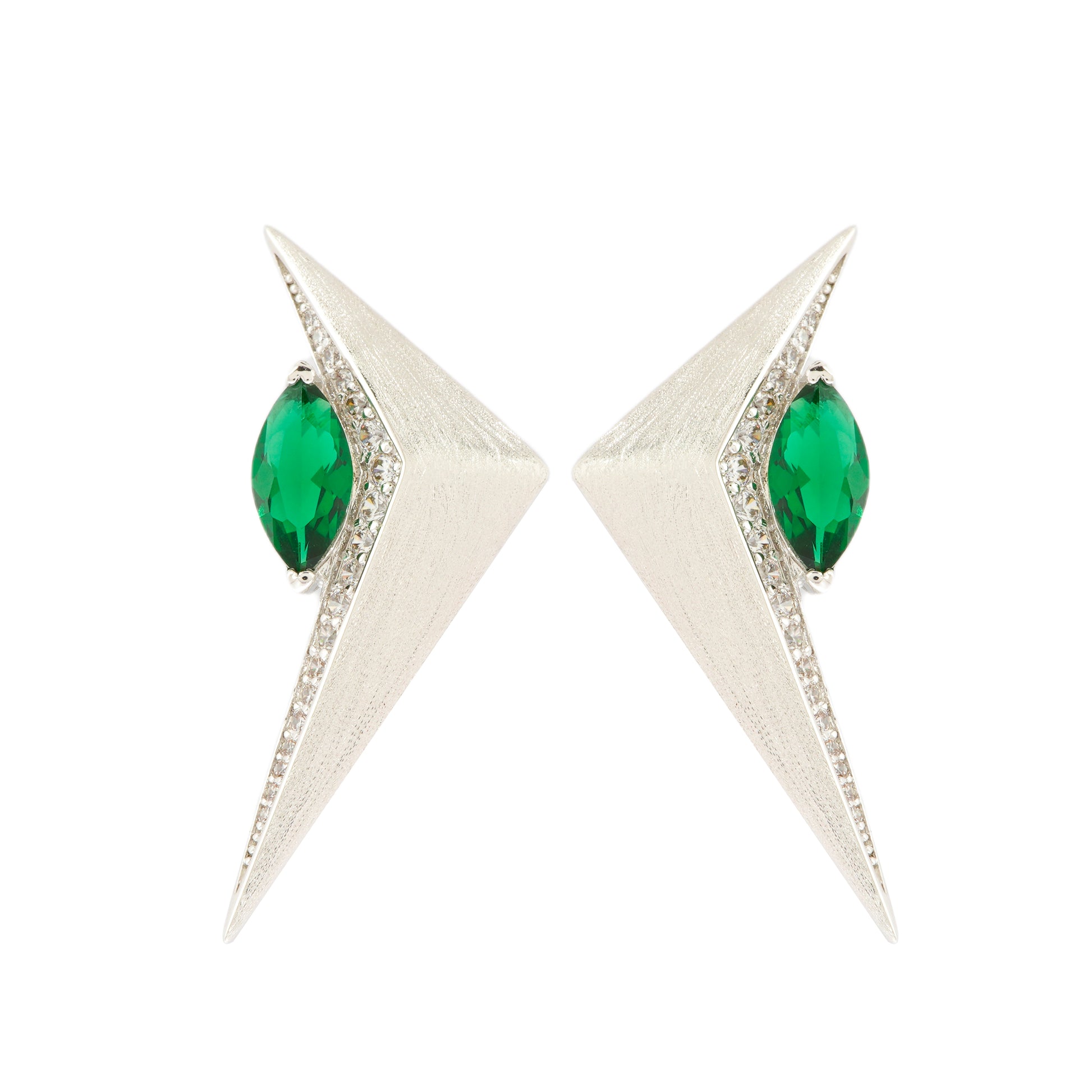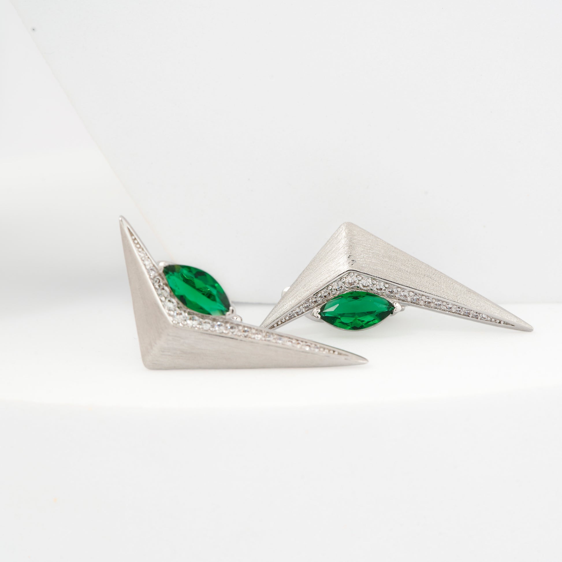 Make a bold style statement with these Silver Angular Statement Earrings, featuring a sleek geometric silhouette that highlights a radiant emerald-green marquise stone at the center. The sharp, angular design in polished silver finish is accented with subtle diamond-like detailing, creating the perfect balance of modern minimalism and luxurious sparkle.