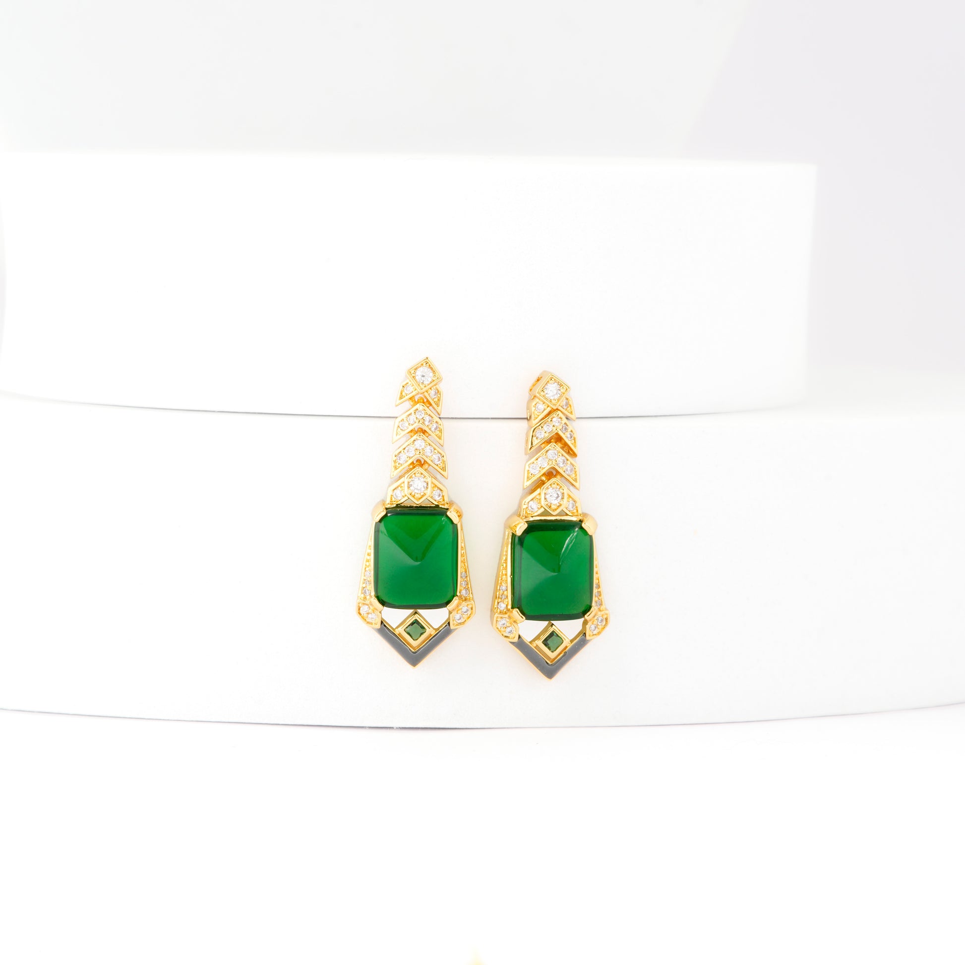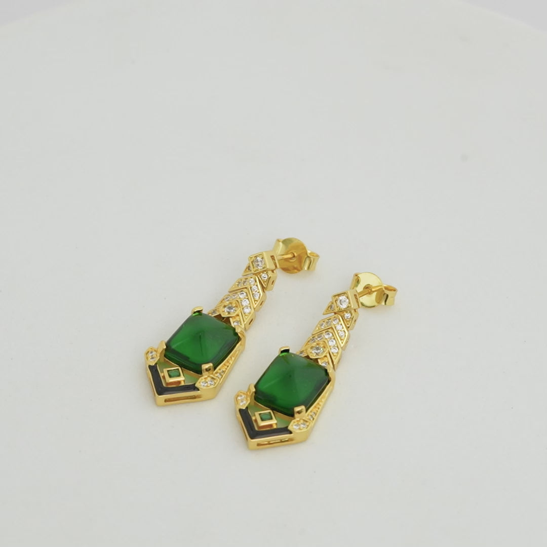 Emerald Green Geometric Drop Earrings | Gold-Toned with Diamond Accents