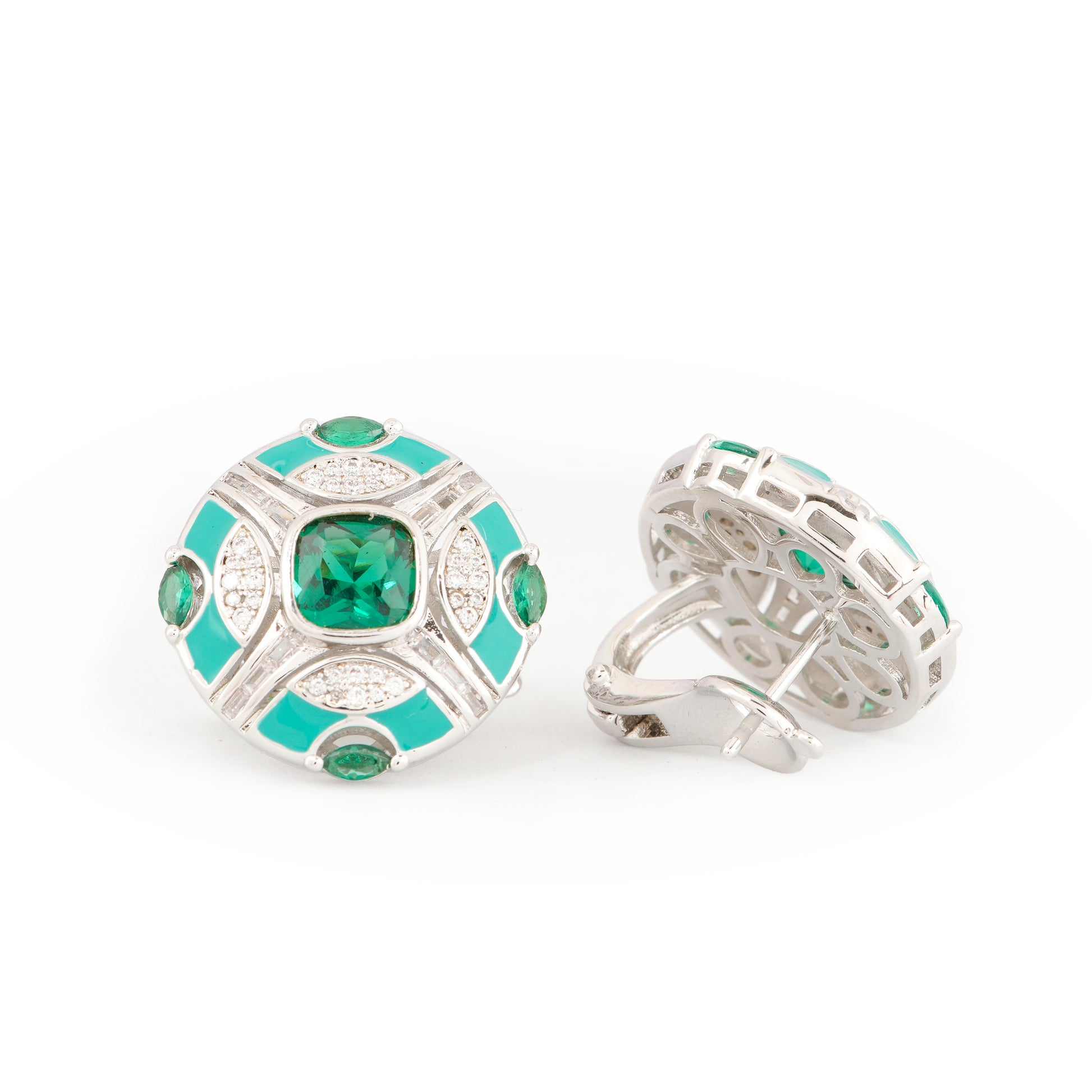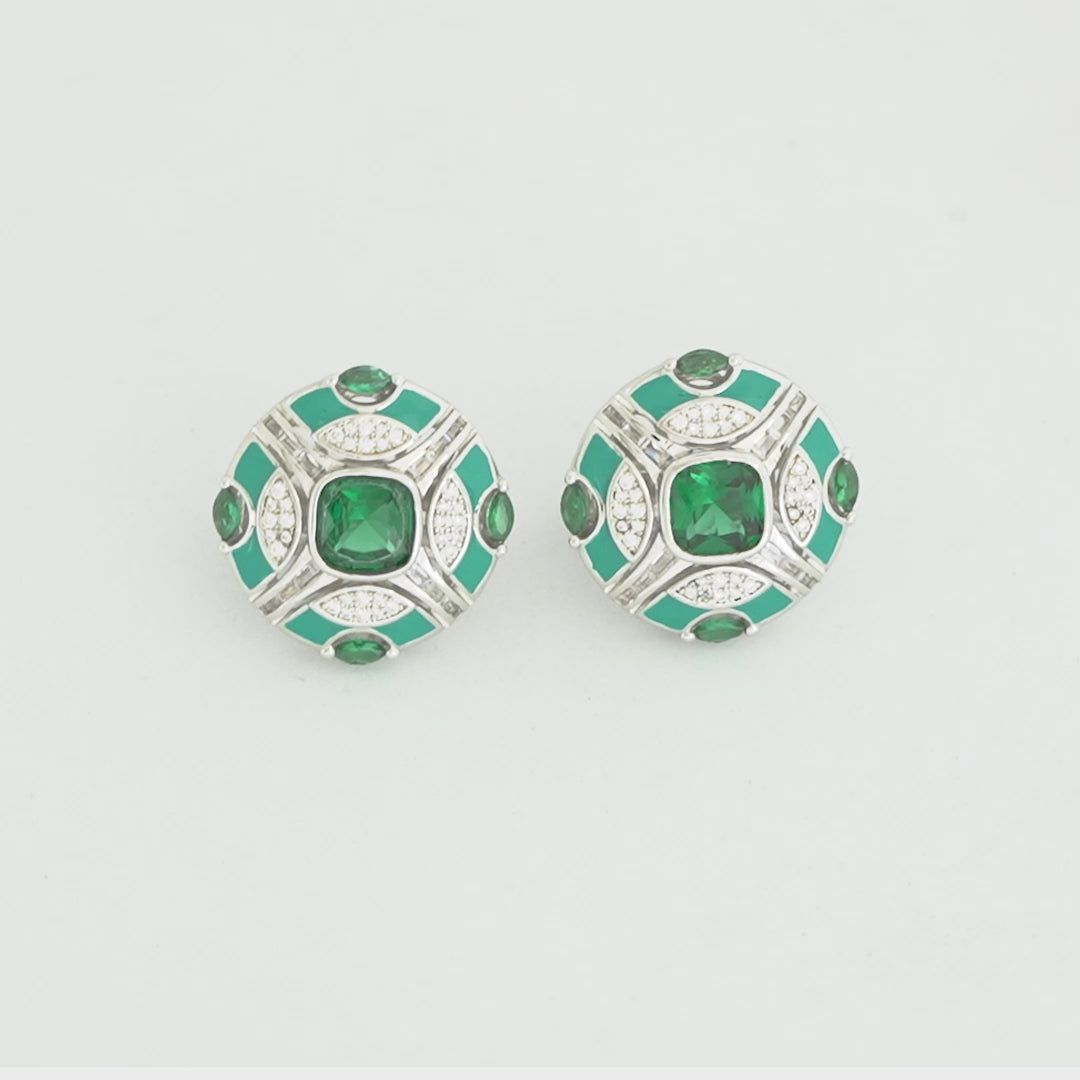 Elegant Silver-Plated Round Stud Earrings with Emerald-Green Gemstones and Diamond Detailing | Modern Luxury Jewelry for Festive, Party, and Everyday Glamour