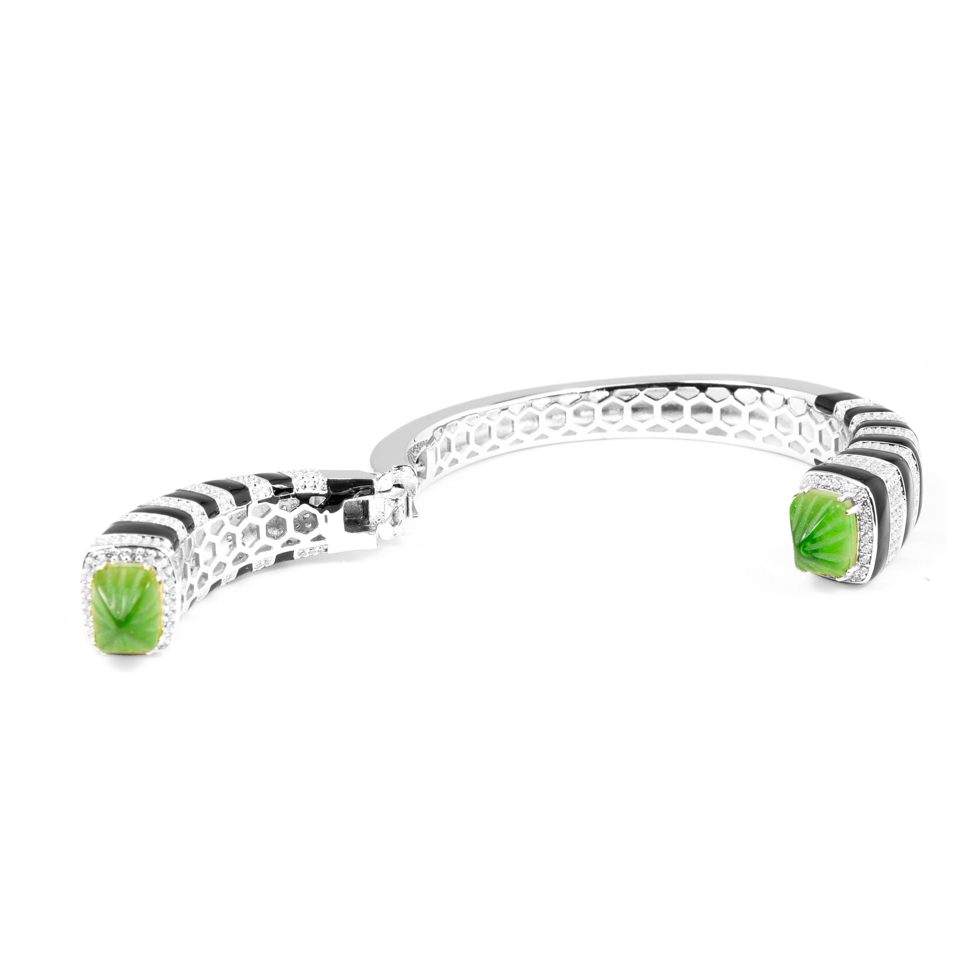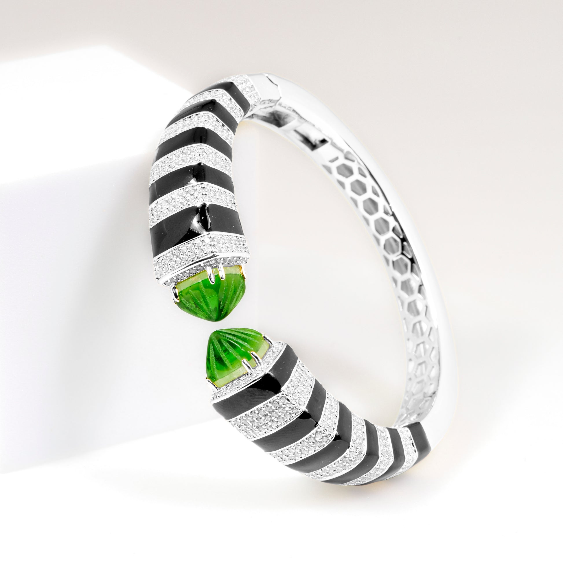 Make a daring style statement with this silver finish open cuff bracelet, designed with striking black enamel stripes and capped with green gemstone tips. The combination of monochrome tones and a pop of vibrant green creates a look that is both edgy and luxurious.