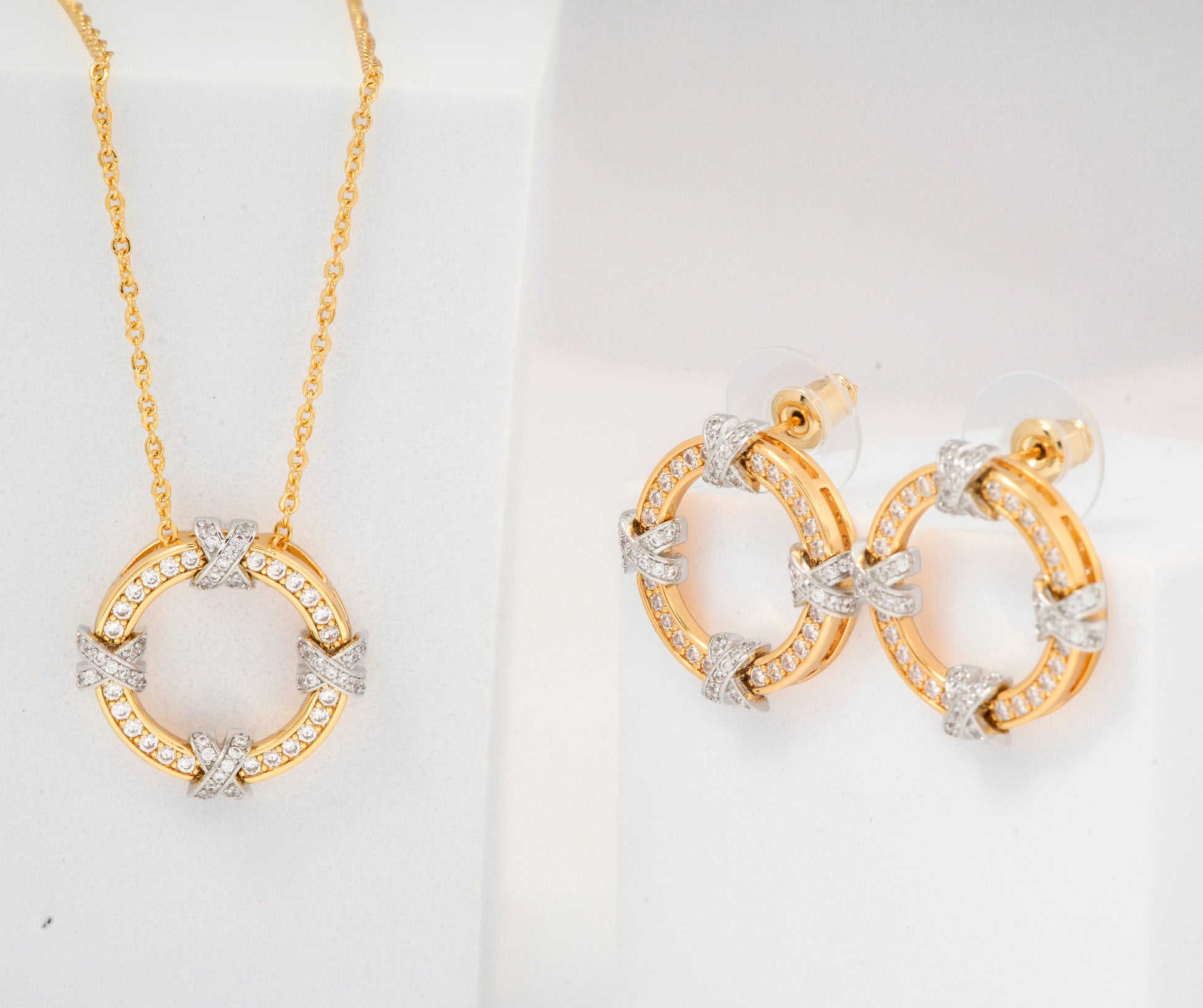 ● Matching circle earrings featuring delicate bow-inspired motifs