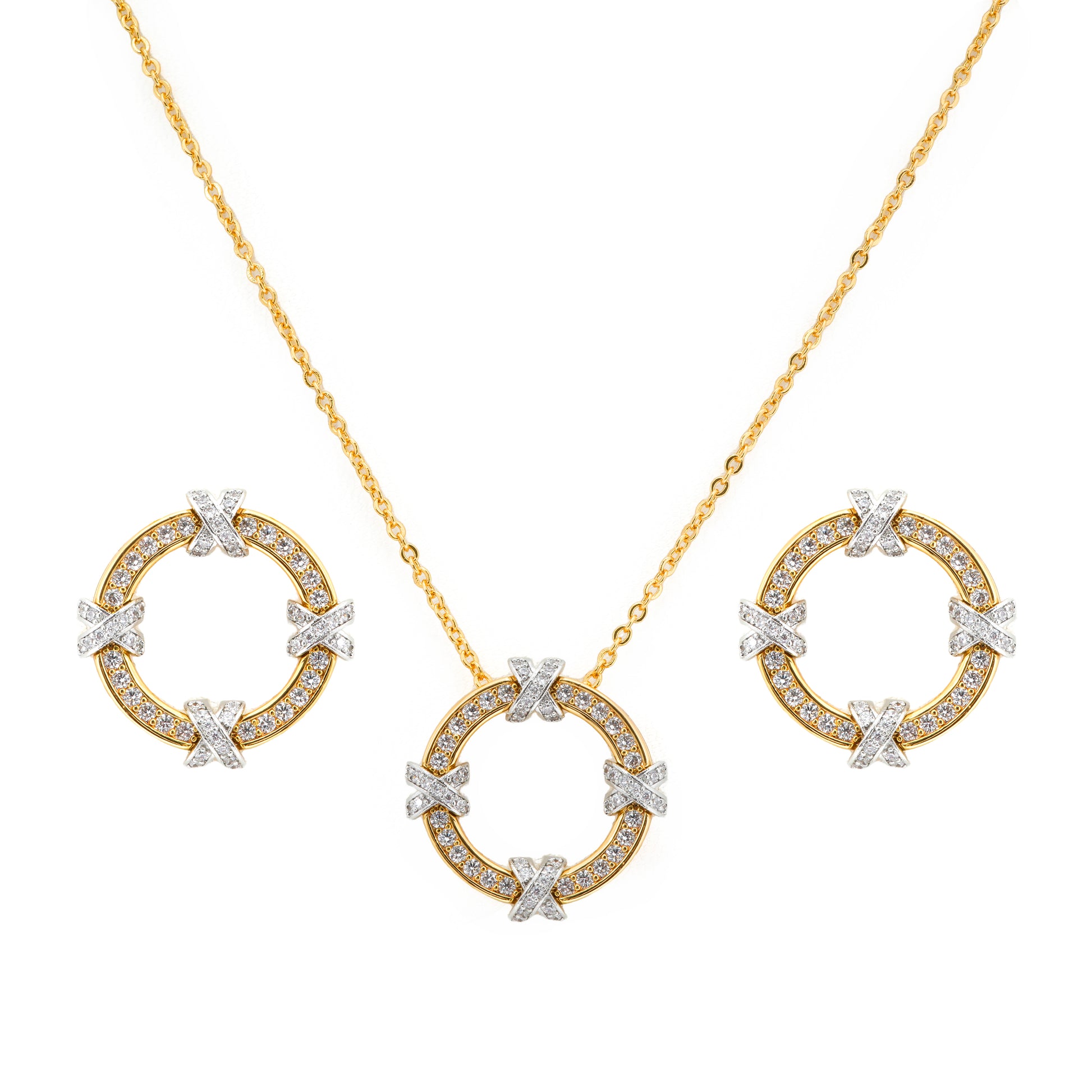 Gold Plated Circle Pendant Necklace and Earrings Set | Crystal Studded Round Jewelry Set for Women | Elegant Party and Festive Wear
