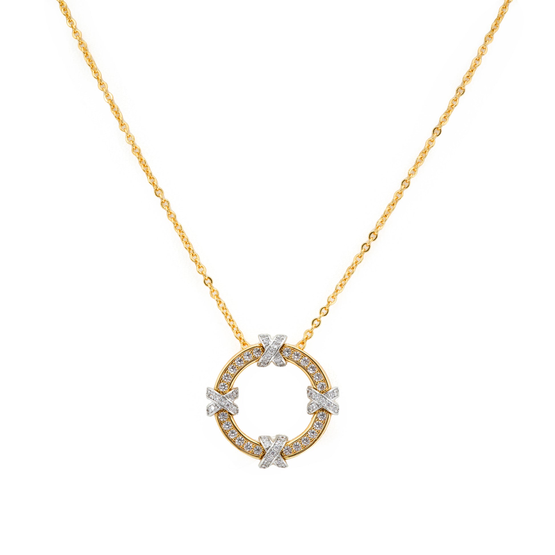 Add timeless sophistication to your collection with this Gold Plated Circle Pendant Necklace and Earrings Set. The round pendant and matching earrings are accented with crystal-studded detailing and finished with delicate bow-inspired motifs, making the design unique and eye-catching. The polished gold plating enhances the sparkle, giving this set a refined yet glamorous charm.