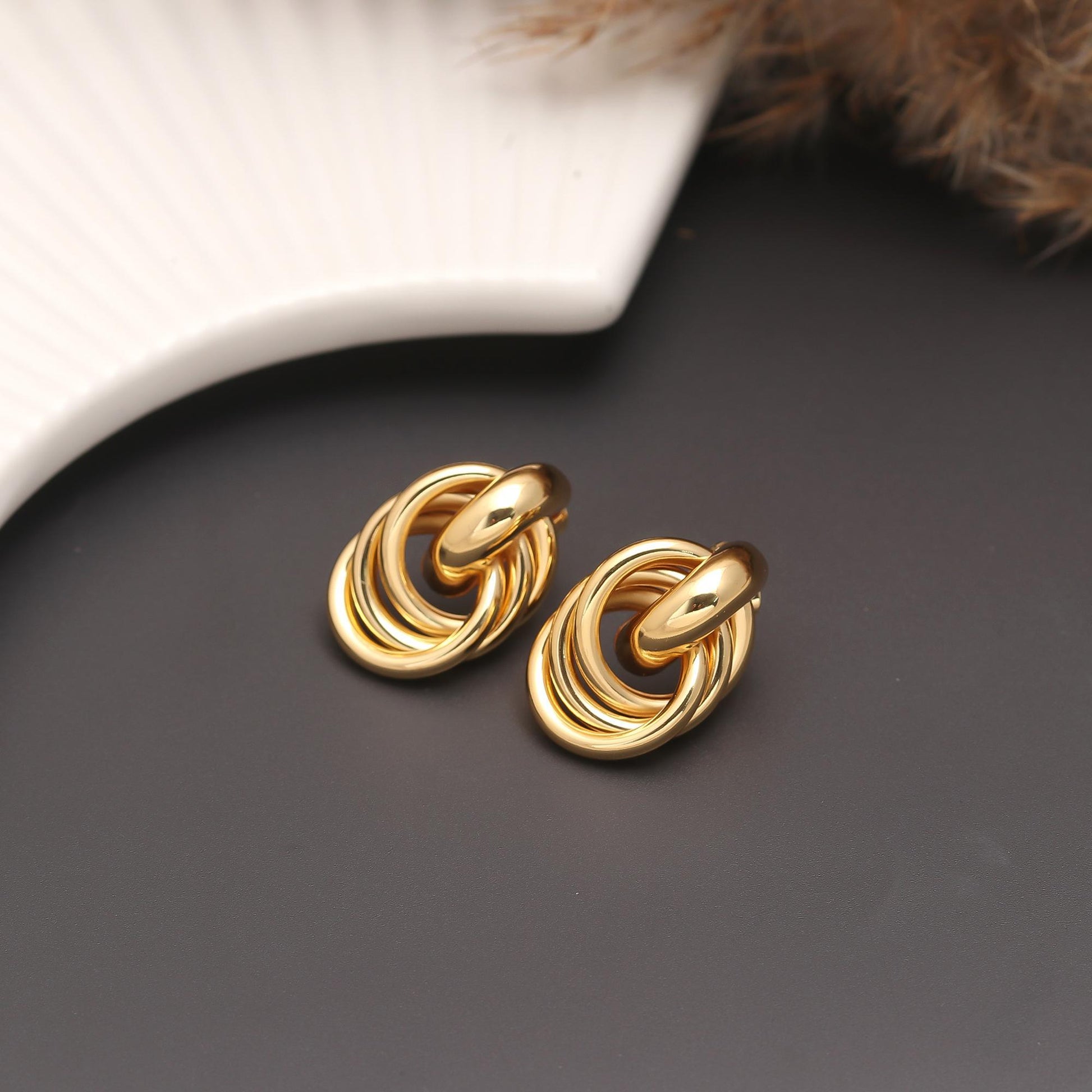 Gold-plated stud earrings with interlinked multi-ring structure