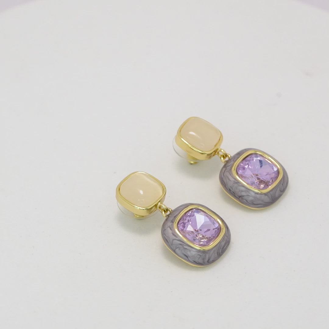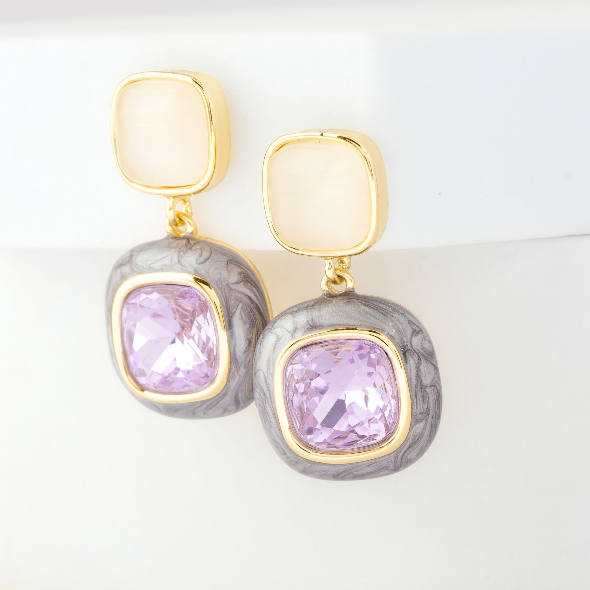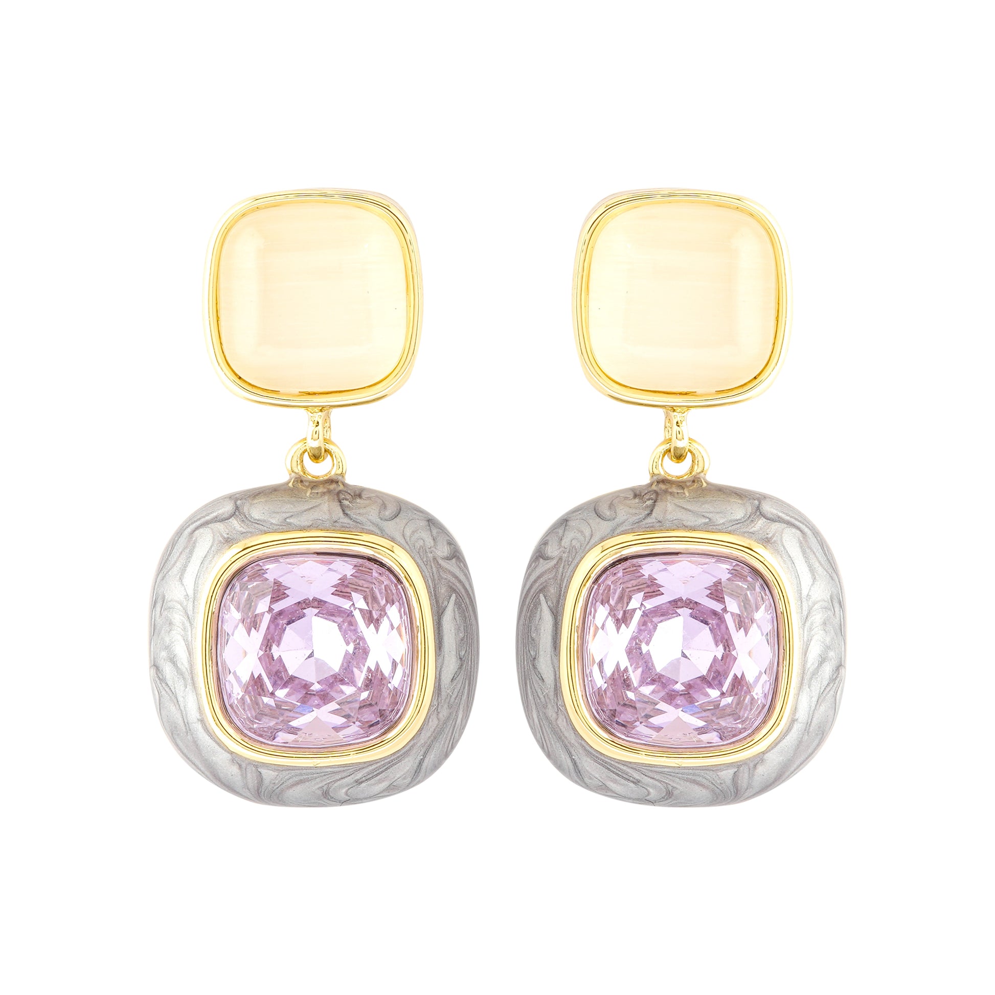 Gold-Plated Dual-Tone Drop Earrings with Cream Enamel Studs and Cushion-Cut Lavender Stone Accents in Textured Silver Frame for Modern Elegance