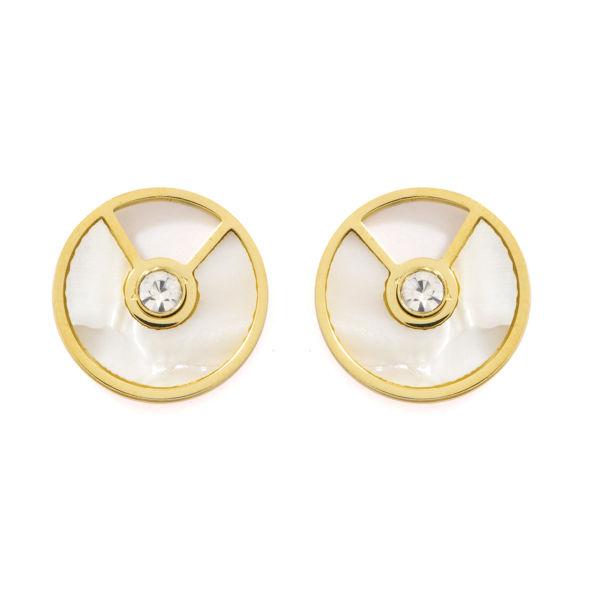 Elegant, circular stud earrings with a modern, open-frame design. Each earring is crafted from a gold-toned material and features a white mother of pearl inlay and a central clear crystal.