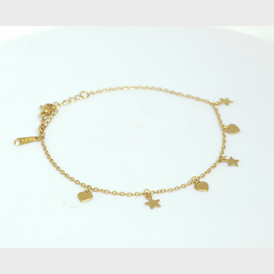 Celebrate the perfect blend of sweetness and sparkle with our Star & Heart Charm Anklet, crafted in a radiant gold-tone finish for a soft, luminous glow. Designed with a delicate, lightweight chain, this anklet features an adorable arrangement of alternating star and heart charms, creating a look that’s whimsical, playful, and beautifully feminine.