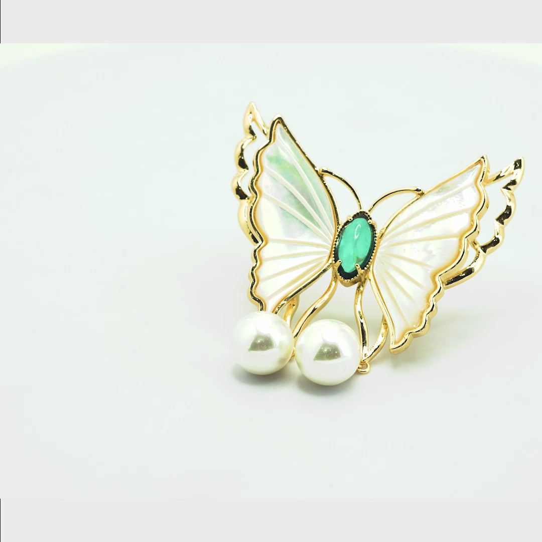 At the center sits a faceted oval green gemstone, forming the butterfly’s body and adding a rich, jewel-toned contrast. Completing the design are two statement round imitation pearls that gracefully dangle beneath the wings, giving the brooch a refined and luxurious finish.