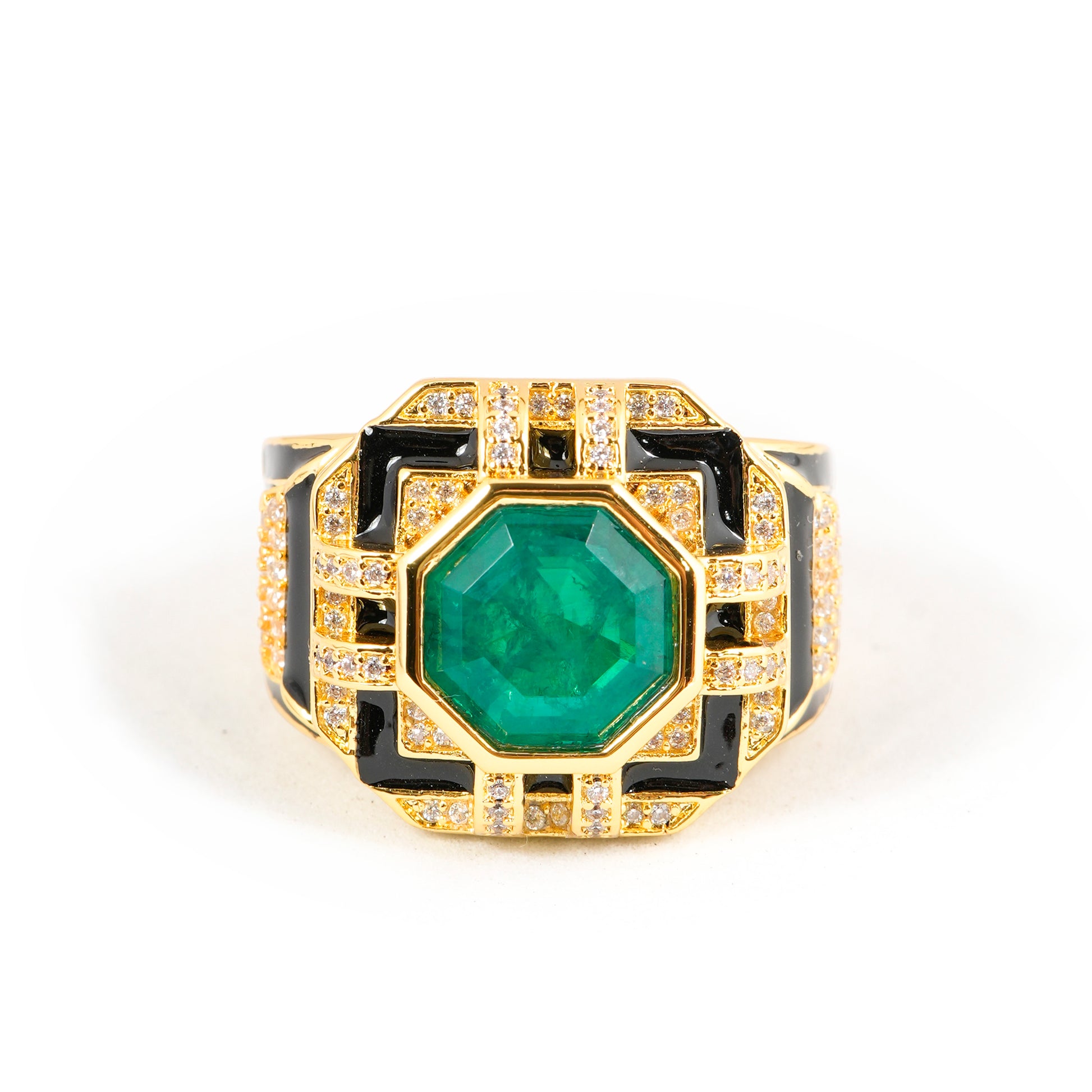Octagonal Emerald Gold Finish Green Stone Ring for Women with Black Enamel Geometric Design and Diamond Look Accents | Statement Cocktail and Wedding Jewelry