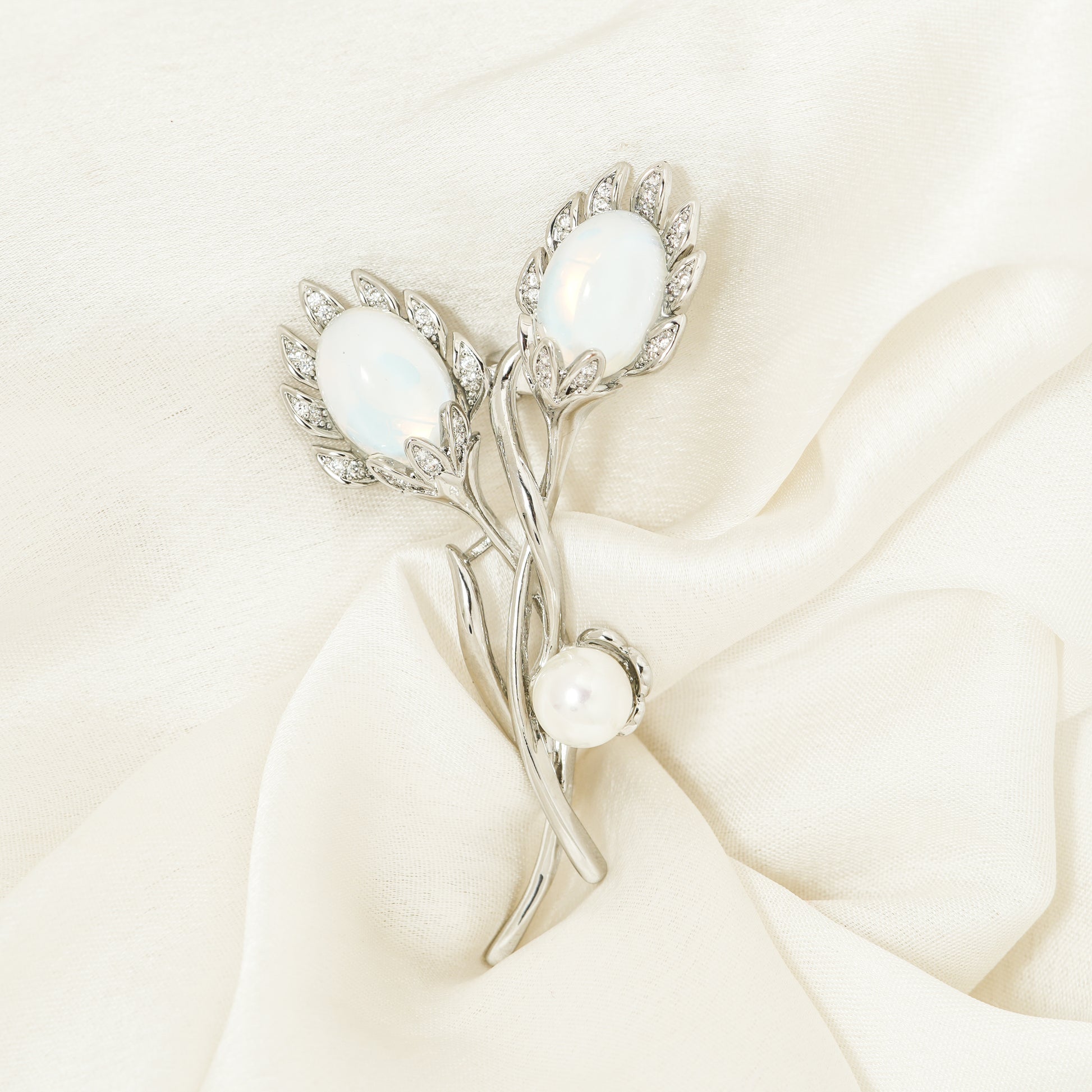 The buds rest on intertwined stems, creating a graceful, flowing silhouette enhanced by a single imitation pearl accent placed thoughtfully along the stem. The combination of opalite shimmer, crystalline sparkle and pearl softness makes this brooch a refined and romantic piece.