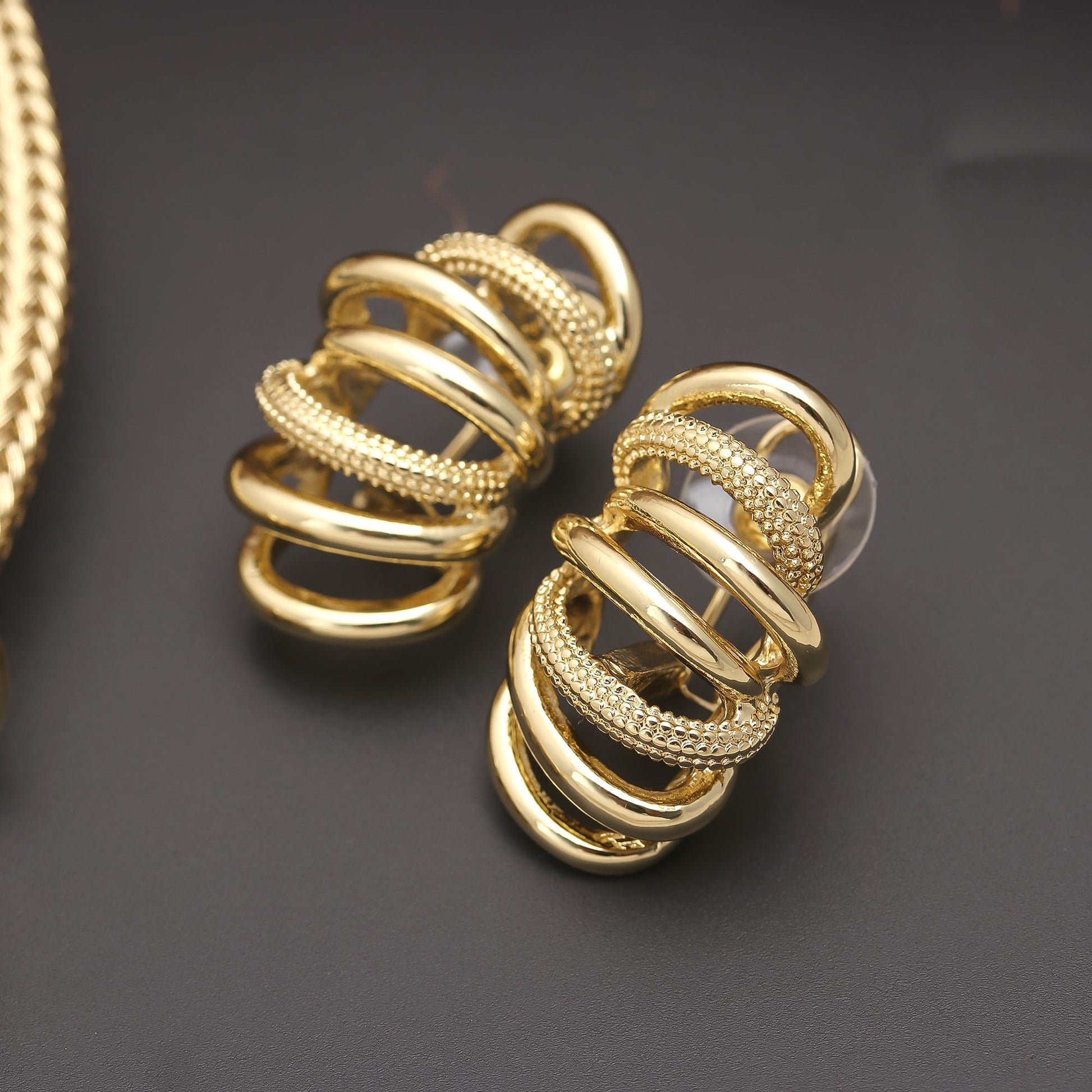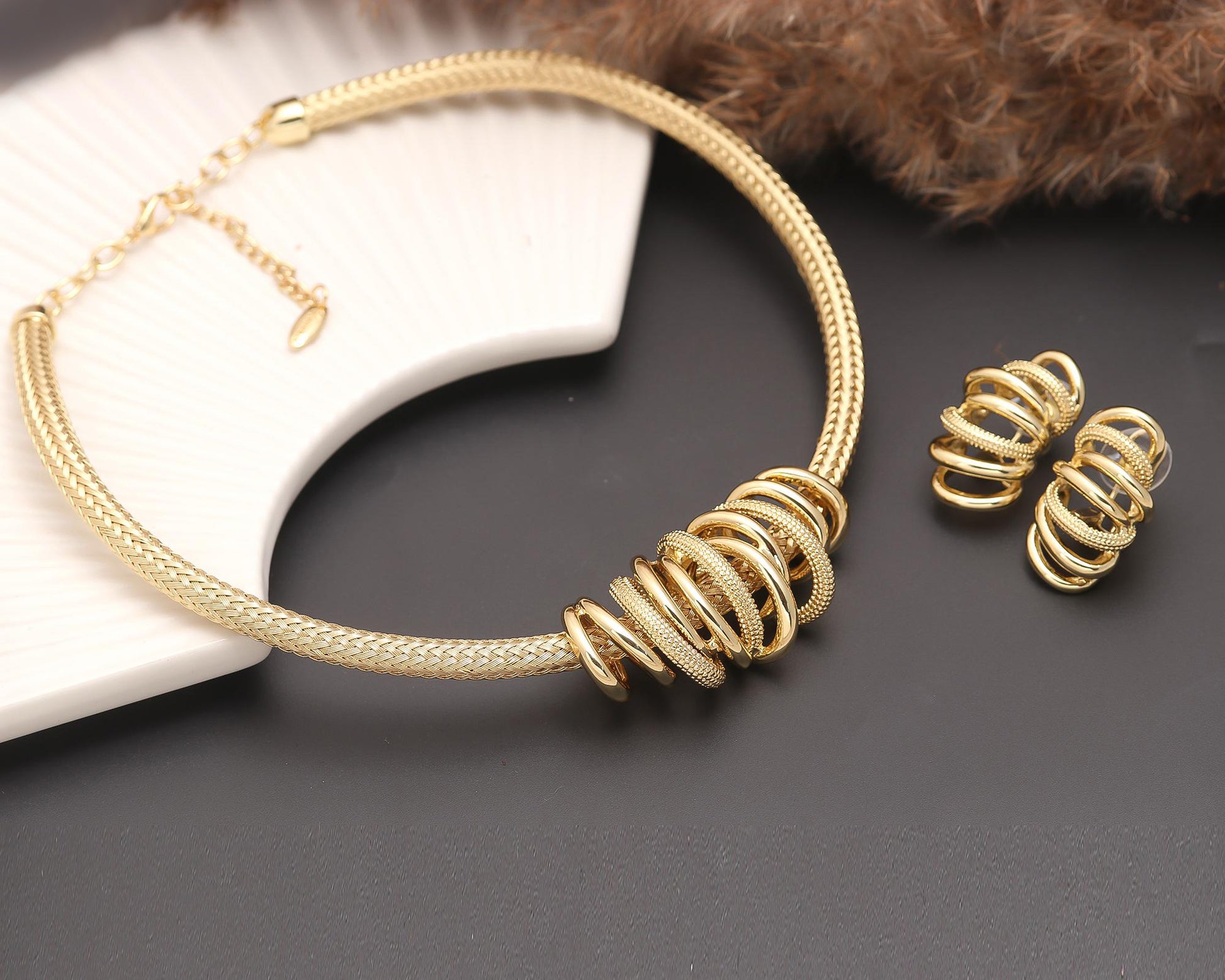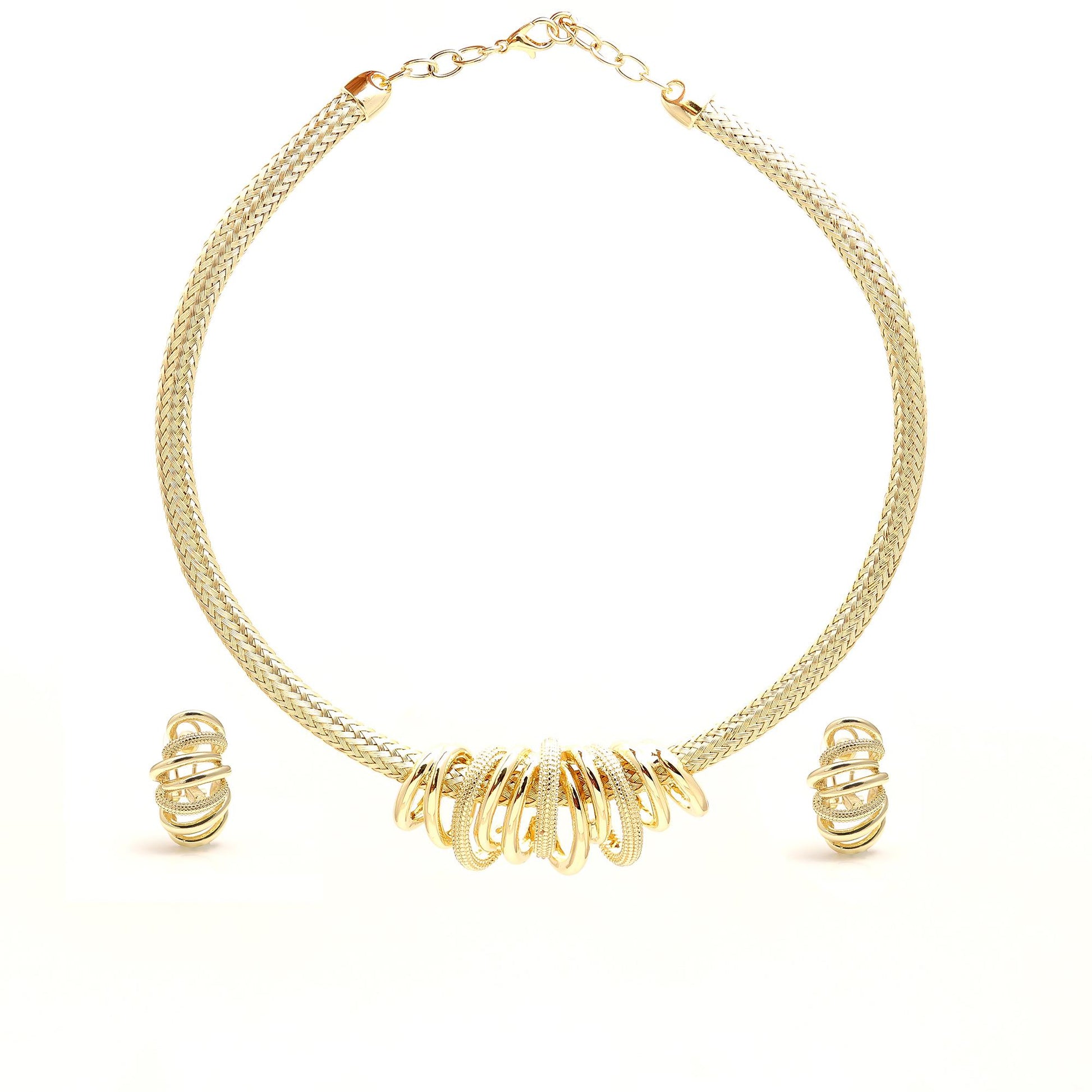 Gold-Plated Statement Choker Necklace with Stacked Ring Detailing and Matching Earrings – Contemporary Jewelry Set