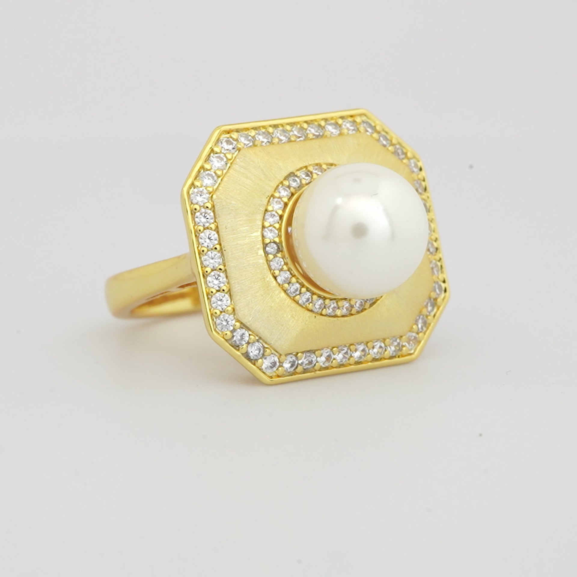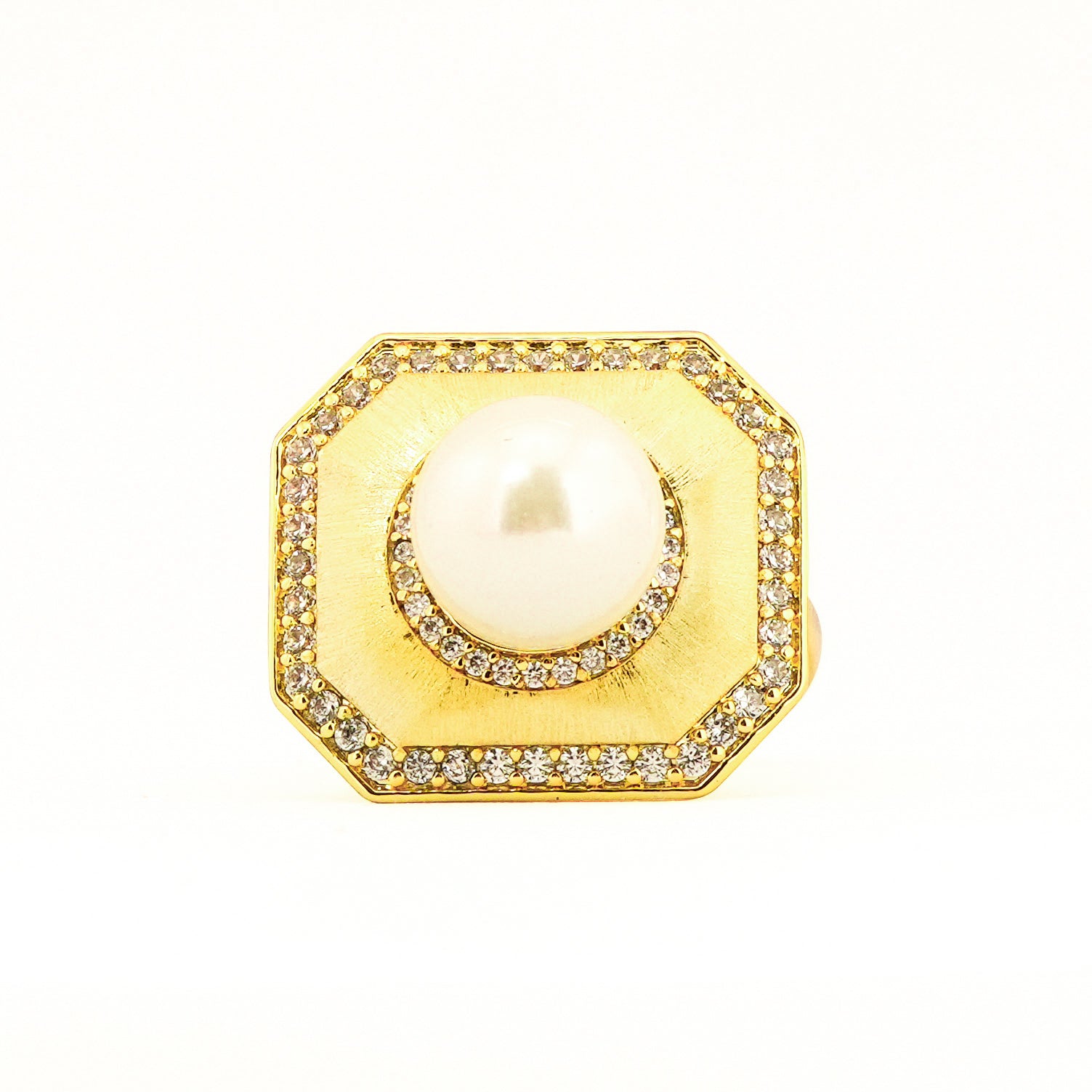 Add a touch of elegance and sophistication with this gold finish pearl statement ring for women, designed with a unique octagon-shaped base and sparkling diamond look border. At the center sits a lustrous faux pearl, giving the ring a timeless and regal charm.